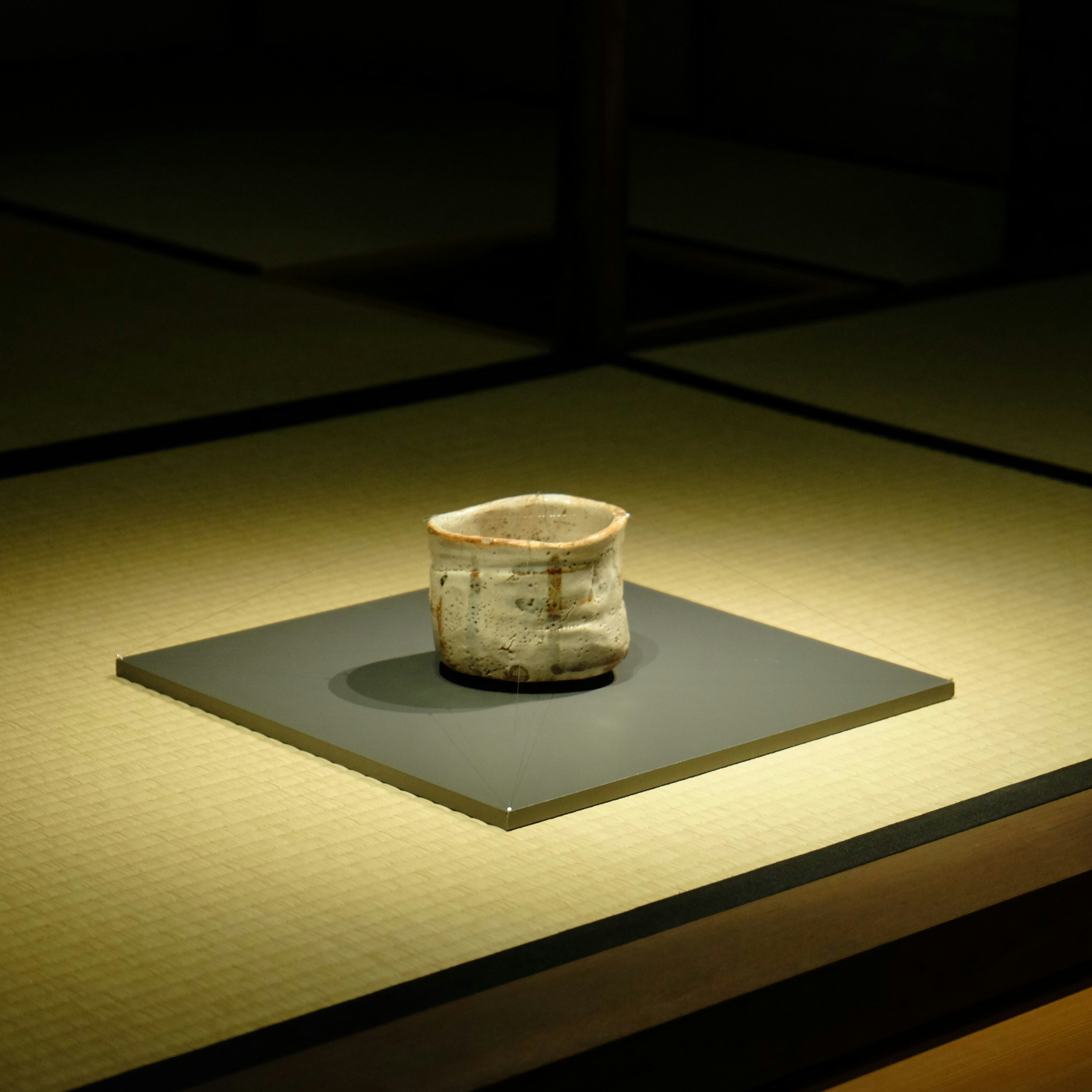 年末年始の三井記念美術館の展覧会において、恒例となっている国宝《志野茶碗 銘卯花墻》(16〜17世紀)も展示されている。桃山時代に美濃の牟田洞窯で焼かれたもので、日本で焼かれた茶碗で国宝となっている2点のうちの1点となるこの名品。その存在感を、茶室を模した空間で確かめることができる。