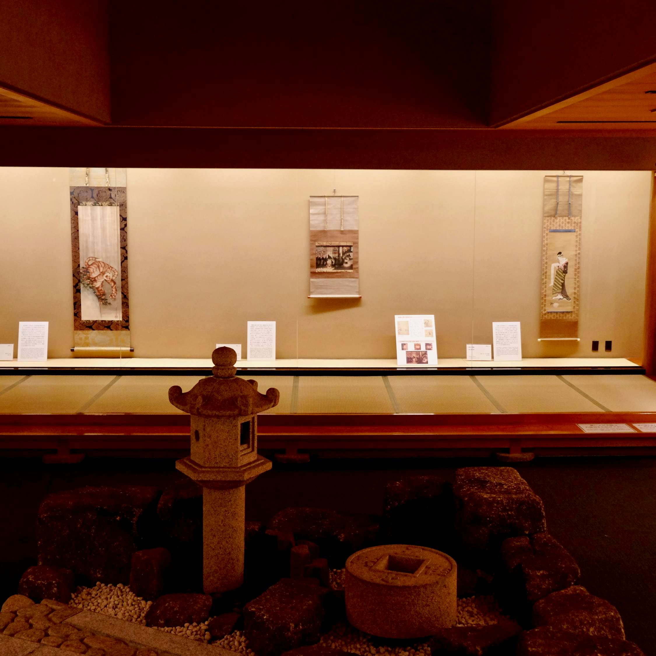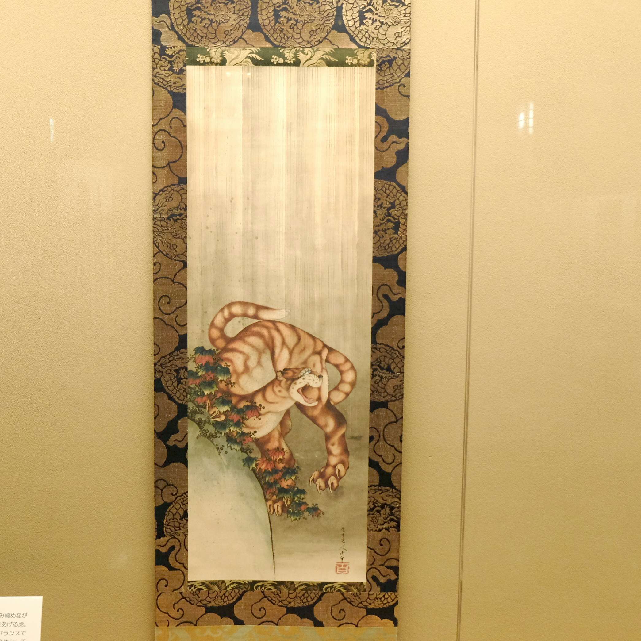 《雨中の虎》は北斎が数え年90歳で世を去った没年の作で、2005年にフランスのギメ東洋美術館が所蔵する《龍図》と双幅になることがわかっている。晩年の北斎の濃厚な色づかいによる、迫力ある虎の姿を楽しめる。