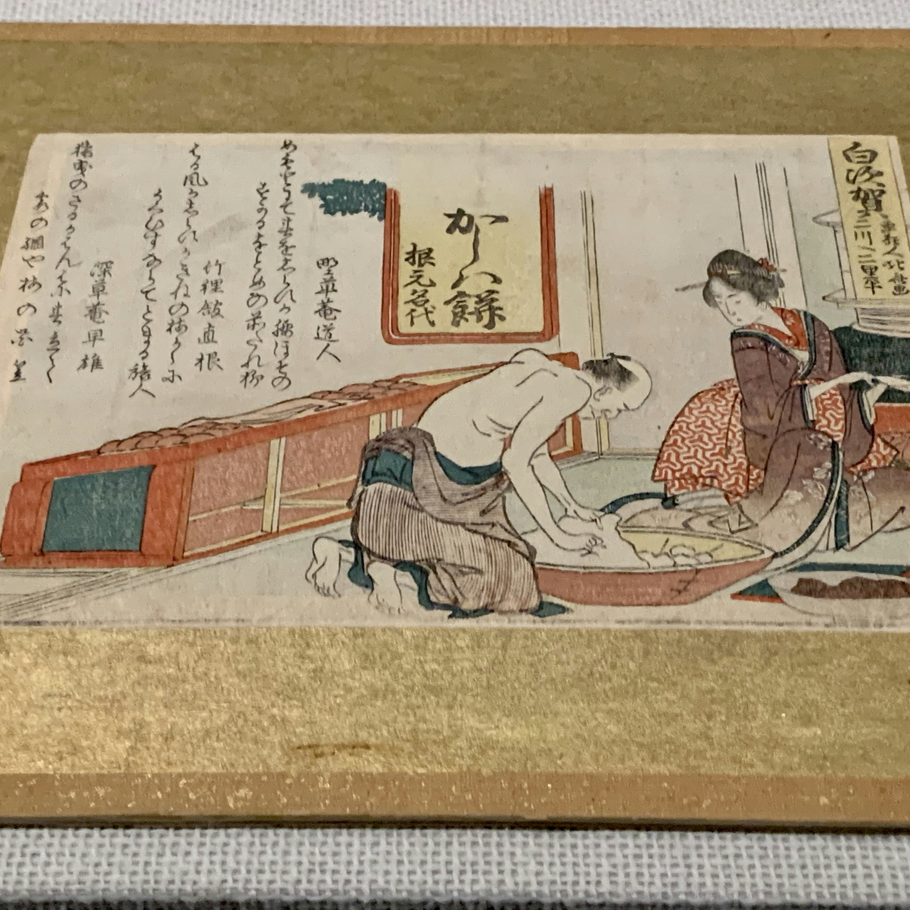 北斎は柏餅をつくる女性を描き、いっぽうの応為はお香を練る女性を描いた。ともに女性が手を動かす姿が描かれているが、注目すべきは手の描写だ。北斎は、美人画においては応為に及ばないと語ったことが伝わっているが、それを物語るように、北斎が描いた手に比べ、応為が描いた手の描写は非常に繊細であることがわかる。