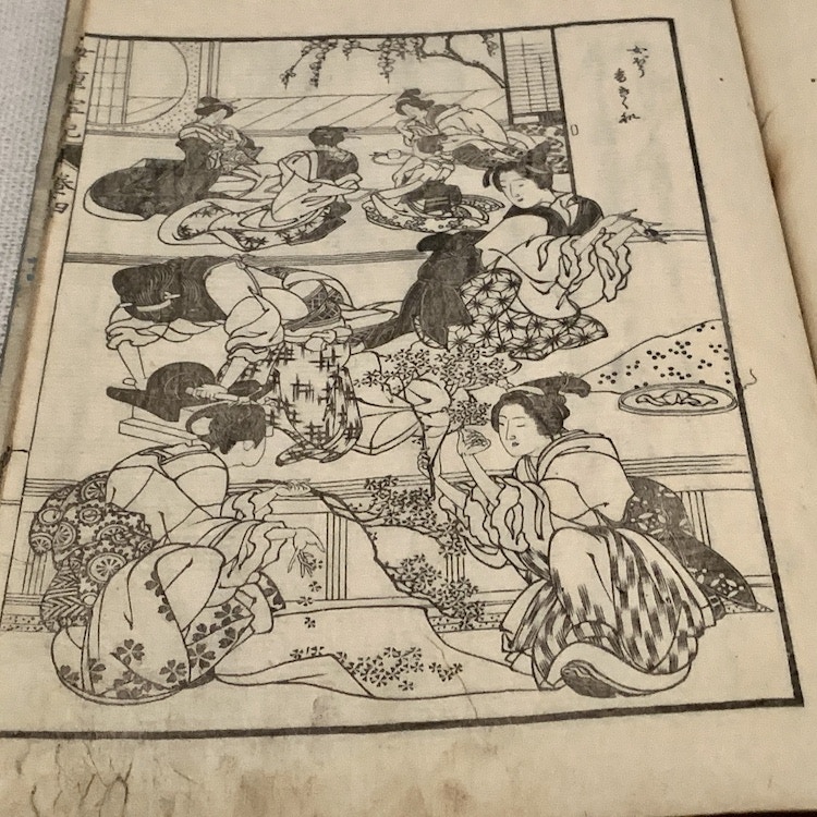 本展では、北斎と弟子の作品が対になるように展示されている。例えば、北斎の《春興五十三駄之内 白須賀》(1804)と、娘・応為(生没年不詳)の《『女重宝記』四 女ぼう香聞く処》(1847)。