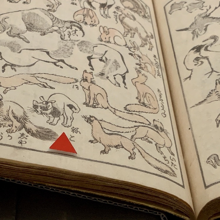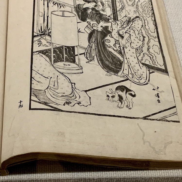 北斎による絵手『北斎漫画』は、今回の本展テーマに打ってつけの題材だ。北斎の愛らしい猫の描写を学んだ魚屋北渓(ととや・ほっけい、1780~1850)と葛飾為斎(1821~1880)。北渓は《北里十二時》(刊年不詳)に、為斎は《『山水花鳥早引漫画』第二編 猫》(刊年不詳)に北斎漫画風の猫を描きこんだ。猫の背中や尻尾の様子などは似ているものの、模様は微妙に異なっている。「それぞれの工夫がわかると同時に、弟子たちがどのように北斎の絵手本を使っていたのか、そして弟子たちの北斎を伝承したいという気持ちが感じ取れる」と山際は話す。