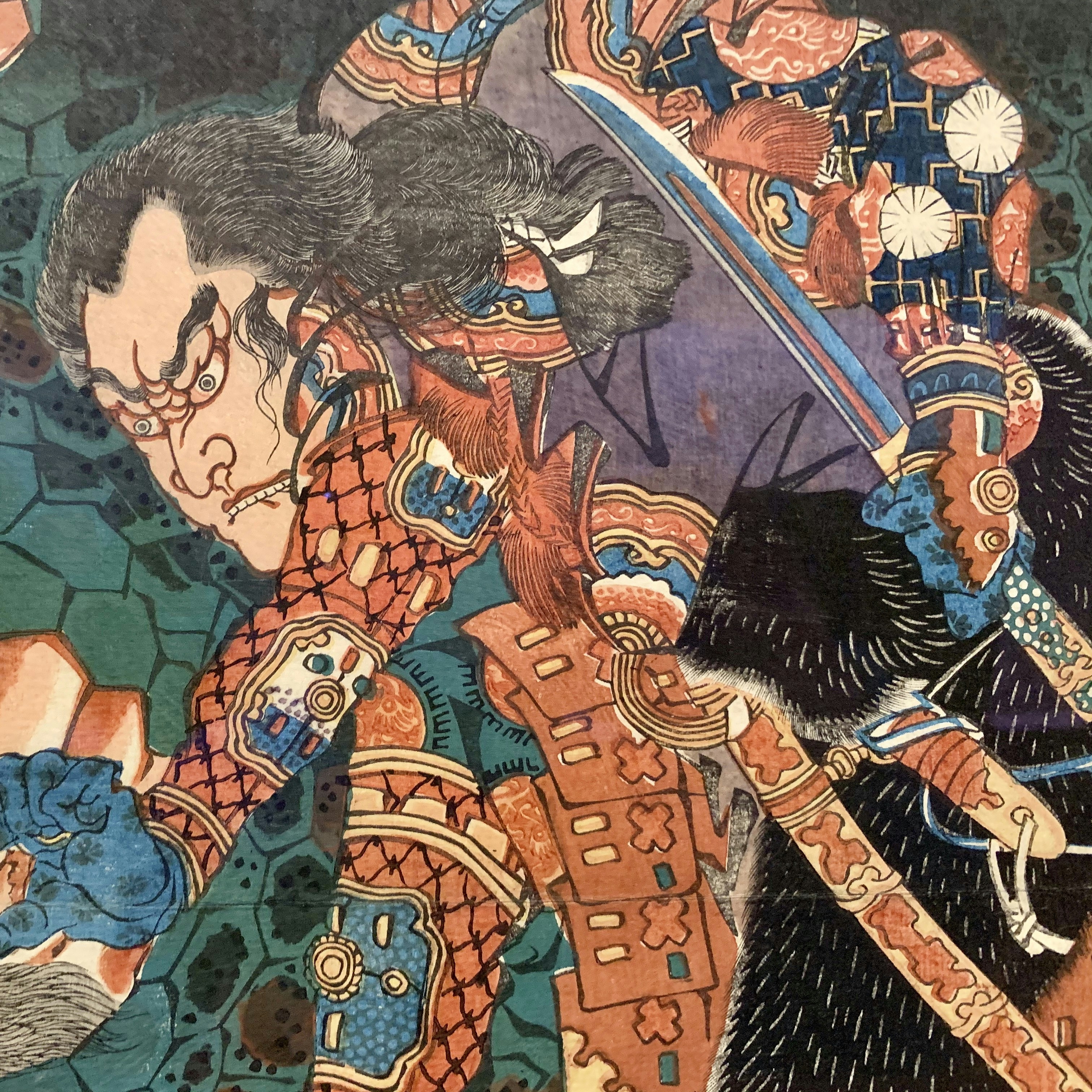 人物描写では、武者絵からも違いを読み取ることができる。北斎の《鎌倉の権五郎景政 鳥の海弥三郎保則》(1830-44)と、卍楼北鵞(まんじろう・ほくが、?~1856)の《椿説弓張月 巻中略図 山雄(狼ノ名也) 主のために蠎蛇を噛んで山中に躯を止む》(1830-44)は、ともに勇壮な武者を描いた作品だ。