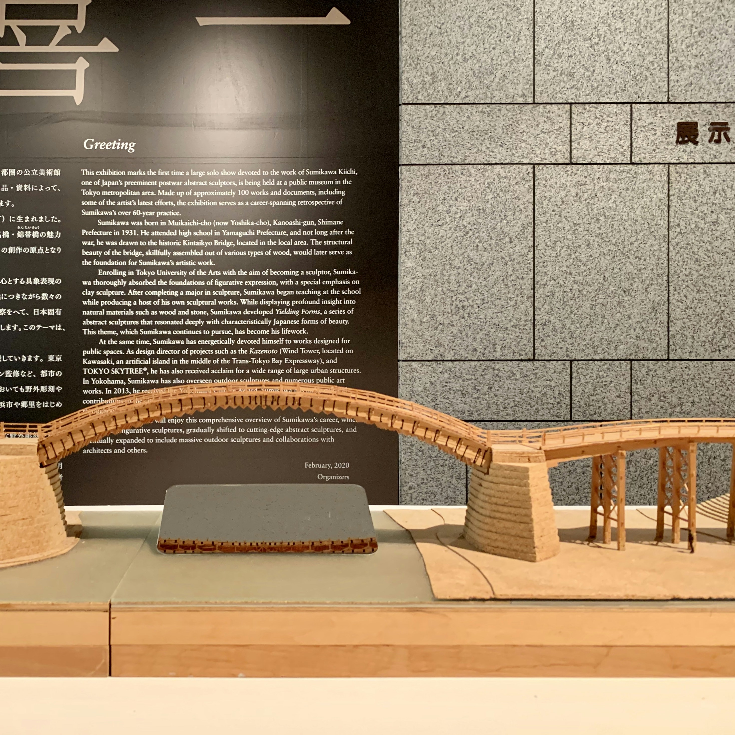 本展は、「プロローグ はじまりとしての錦帯橋」のほか、「いしずえ 具象をきわめる」「深まり 素材と向き合う」「ひろがり 公共空間を活かす」「匠 そりとむくり」の4章構成。展覧会の起点となるのは、澄川が思春期から青年期を過ごした山口県岩国市にある錦帯橋だ。