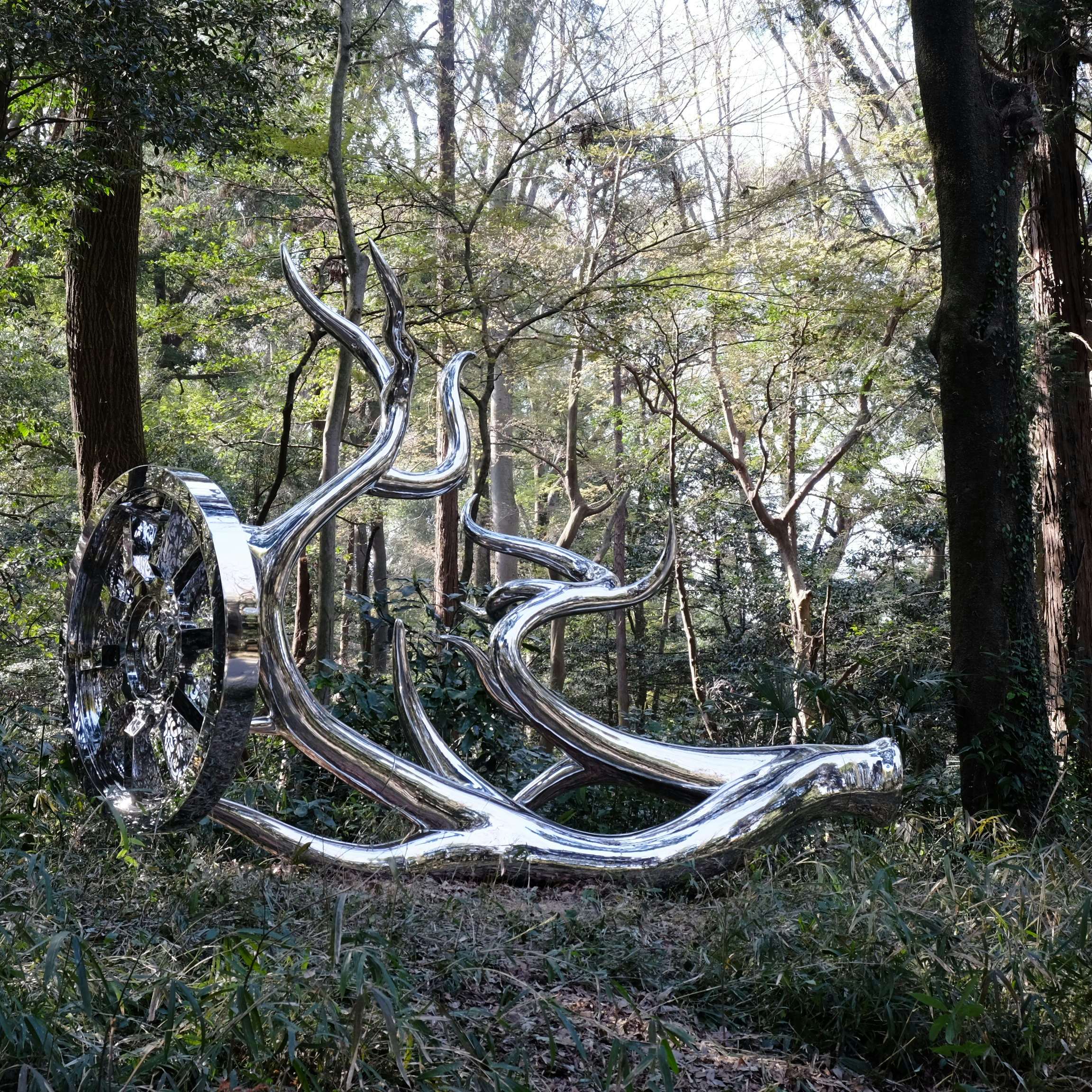 展示作品はすべて、明治神宮内の神宮の杜に設置されている。まず、多くの人が利用するJR原宿駅に近い南参道鳥居から境内に入り、参道を歩くと見えてくるのが松山智一《Wheels of Fortune》(2020)。溶接したステンレスを研磨して鏡面状に仕上げた本作は、鹿の角と車のホイールとうふたつのモチーフを組み合わせた作品だ。