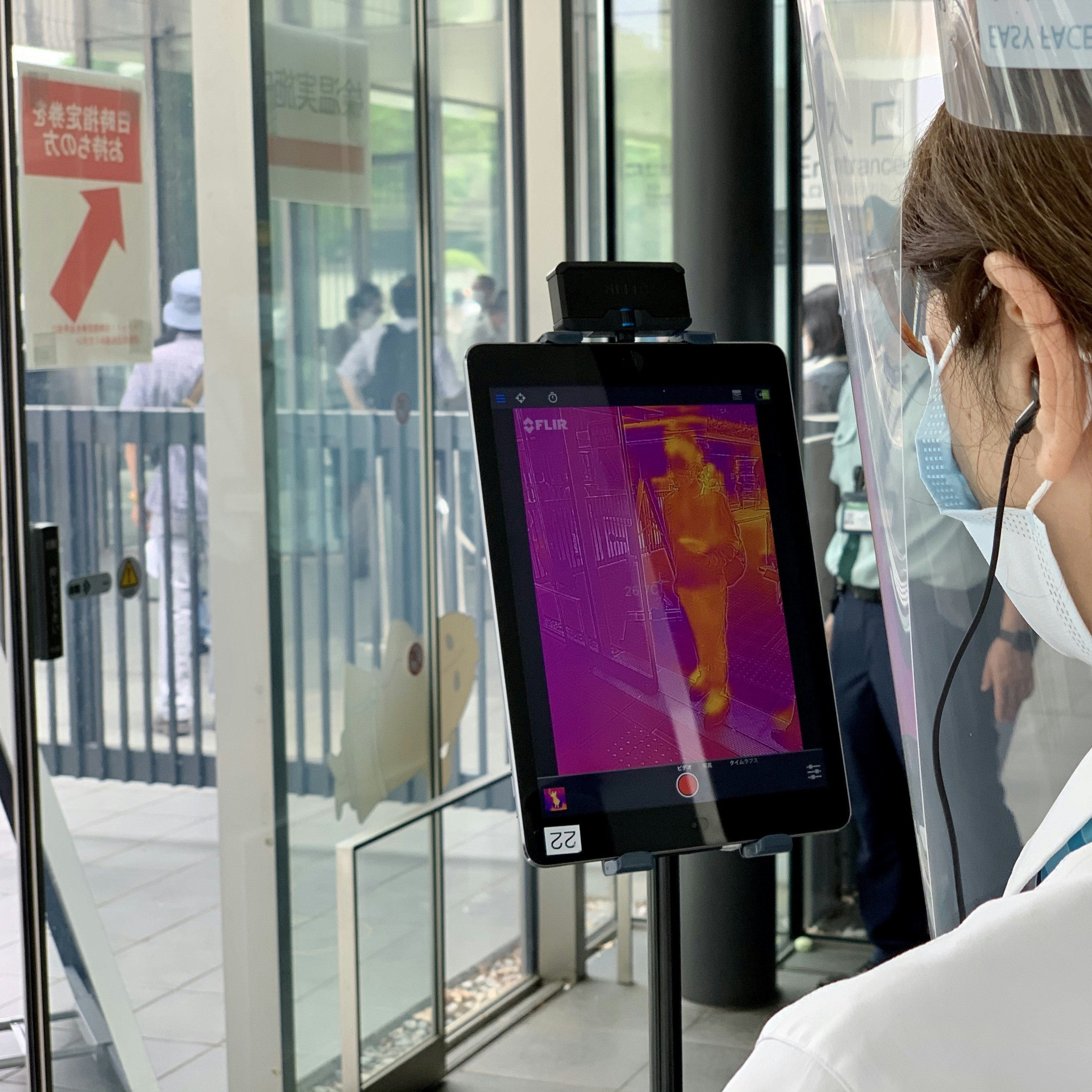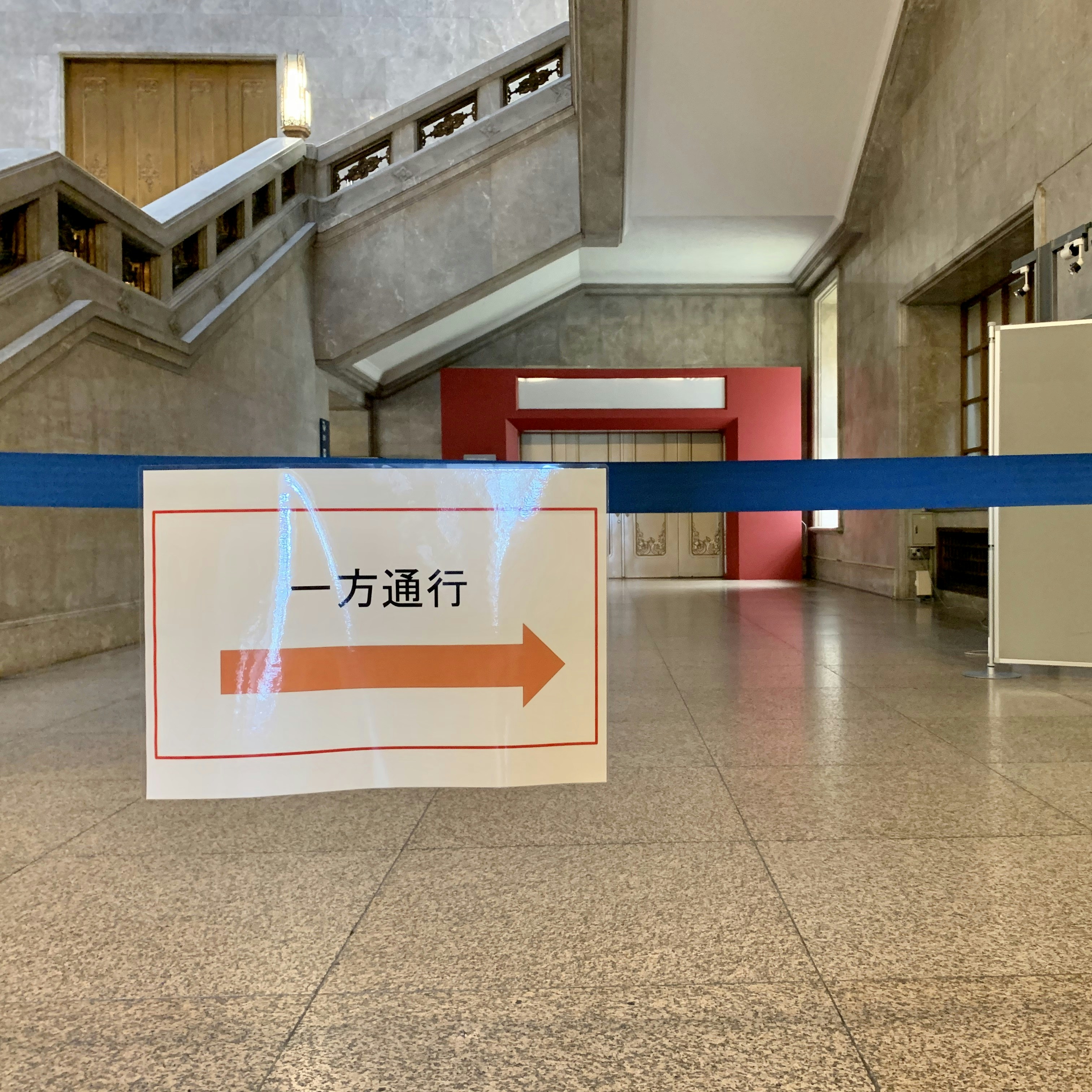 再開初日のこの日は、10時30分の開館前から50人ほどが列をなした。正門前には、入場をスムーズにするためのガイドポールが設置されており、本来ミュージアムショップがある建物で、ひとりずつ検温を実施。37.5度以上の熱がある場合は入館を断る。