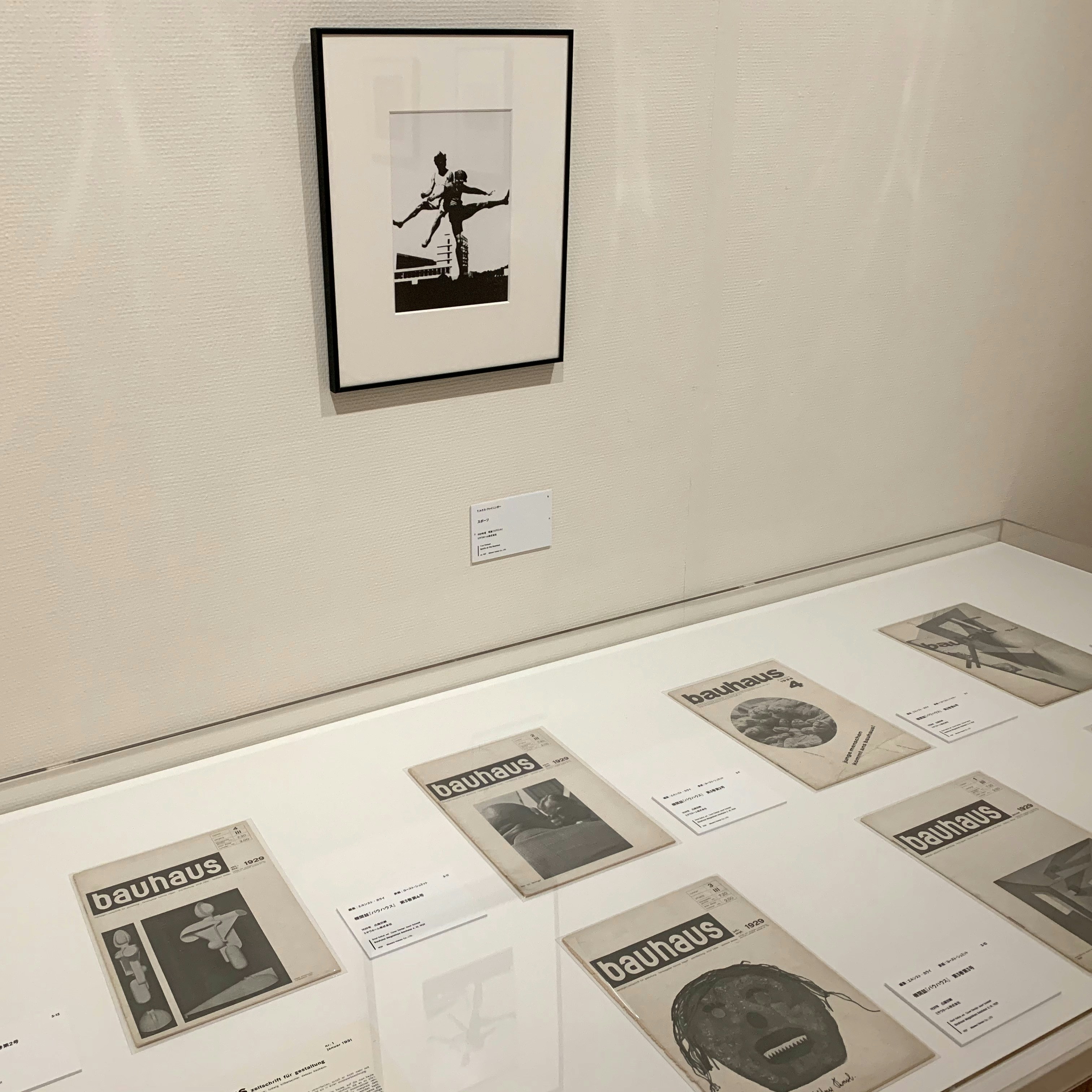 第1章「学校としてのバウハウス」では、バウハウス・デッサウ校舎の竣工にあわせて刊行された機関誌『バウハウス』や、建築・デザイン・芸術の先端的な動向に焦点を当てる「バウハウス叢書」シリーズ、そして校舎で活動する学生たちの姿をとらえた写真などの資料が並ぶ。