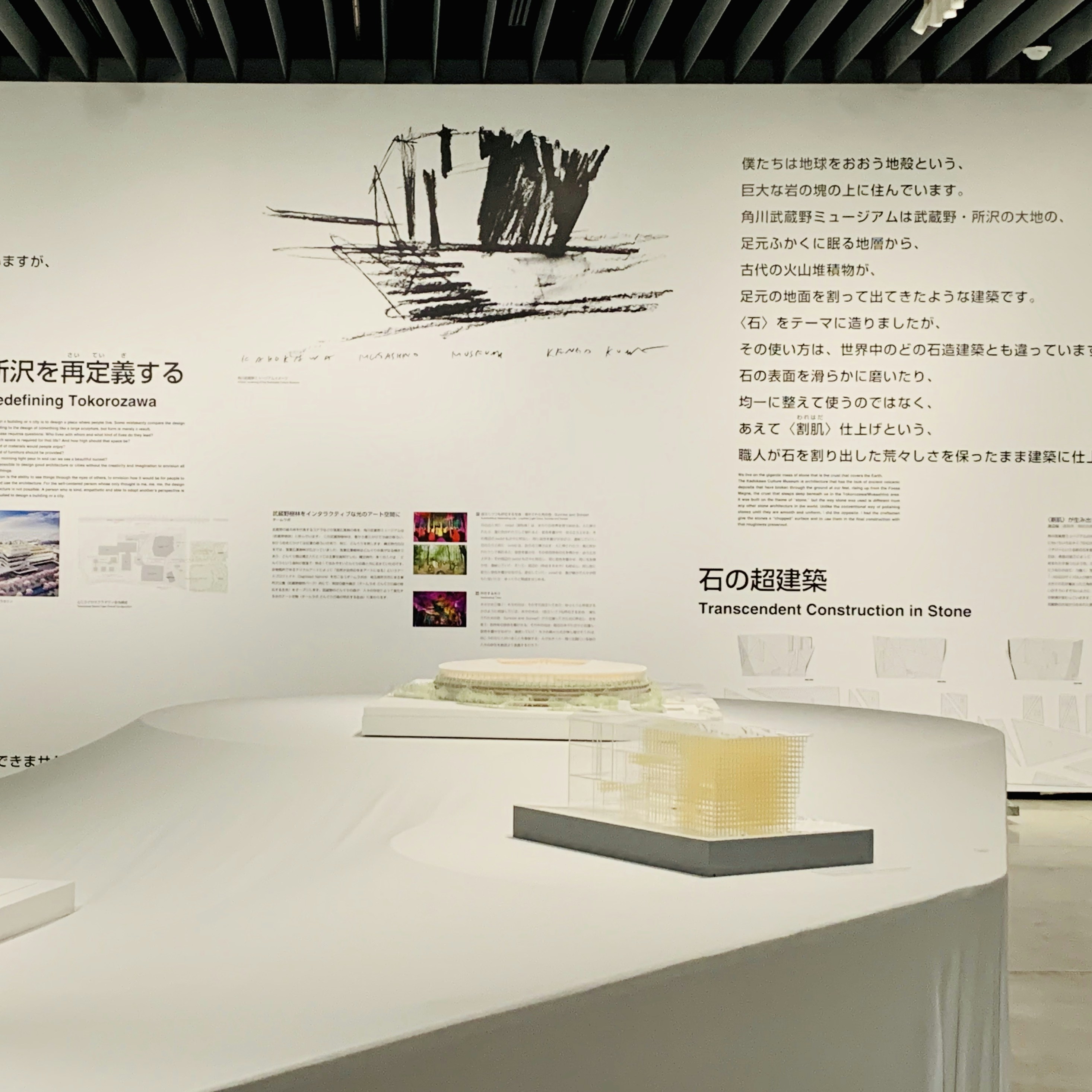 本展は、角川武蔵野ミュージアムの建物自体をメイン作品としてとらえ、その建築を解説するような展覧会。外観や内部空間(一部のエリア)・周辺のランドスケープデザインを公開するとともに、構想から設計、実際の工法までを、隈のテキストや設計図、インタビュー映像など、様々な資料で紹介する。