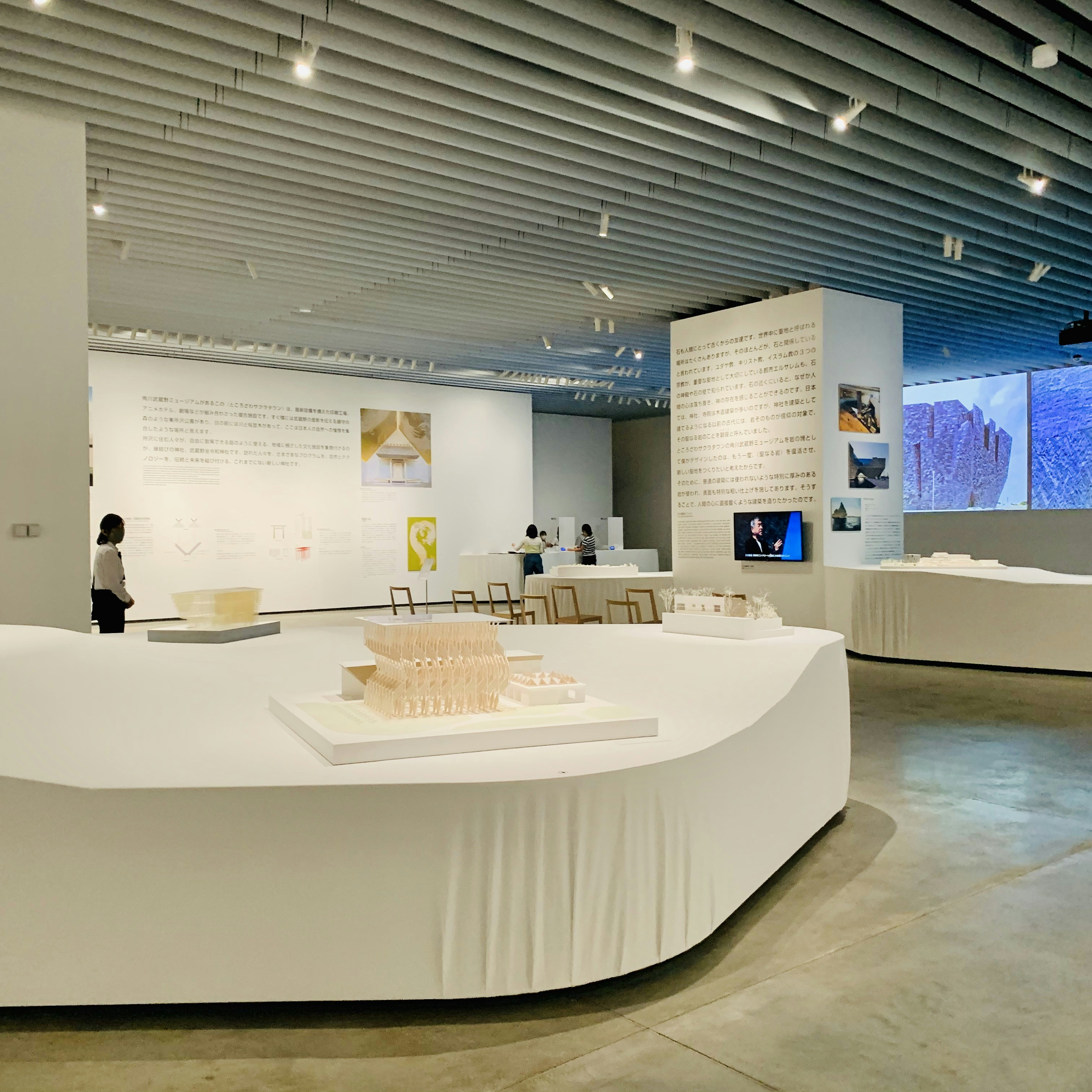 木の建築では、国立競技場(東京)や村井正誠記念美術館(東京)など4点を、石の建築ではV&Aダンディ(スコットランド)や石の美術館(栃木)など4点を見ることができる。模型にはもちろん、展覧会会場である角川武蔵野ミュージアムも含まれている。