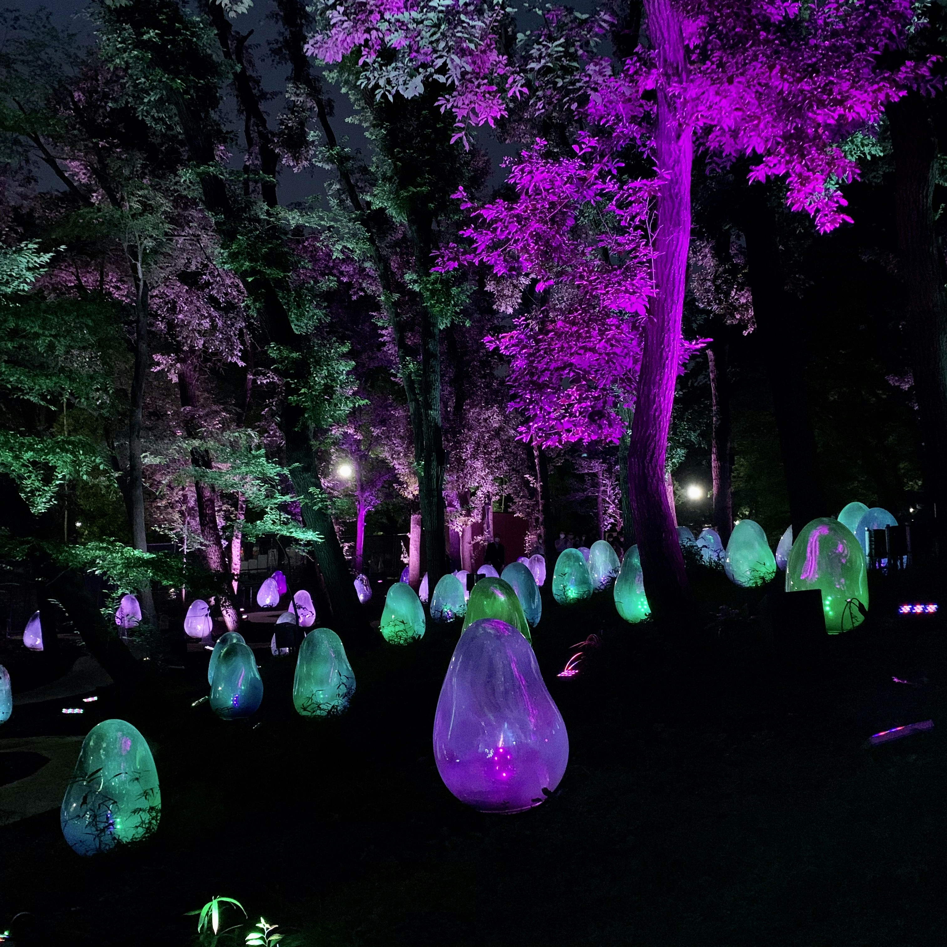 また、角川武蔵野ミュージアムに隣接する東所沢公園内にオープンした「武蔵野樹林パーク」も注目のスポットだ。武蔵野樹林パークでは「チームラボ どんぐりの森の呼応する生命」が常設展示され、2つの作品《自立しつつも呼応する生命 - 液化された光の色》と《呼応する木々》が展示。