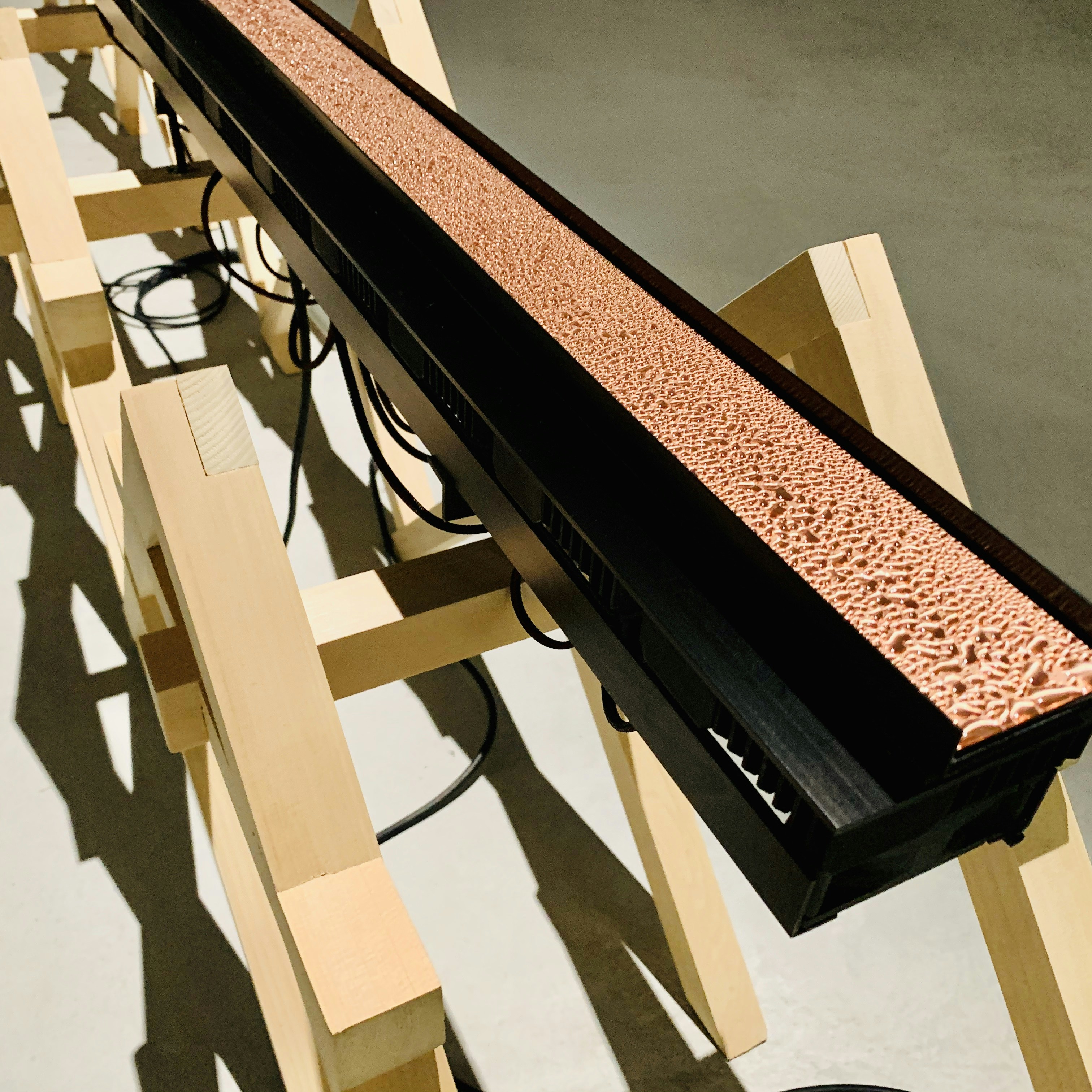 音や泡、微生物など、多様な素材を用い、自然現象をメディアテクノロジーに取り込む作品を手がけてきた三原総一郎。今回は、水を扱った作品《無主物》を発表した。これは、目には見えない空気中の水分を変化させ、可視化させる装置。実際に展示室では、天井に設置した作品の一部から雫が滴り落ちる様子も見ることができる。