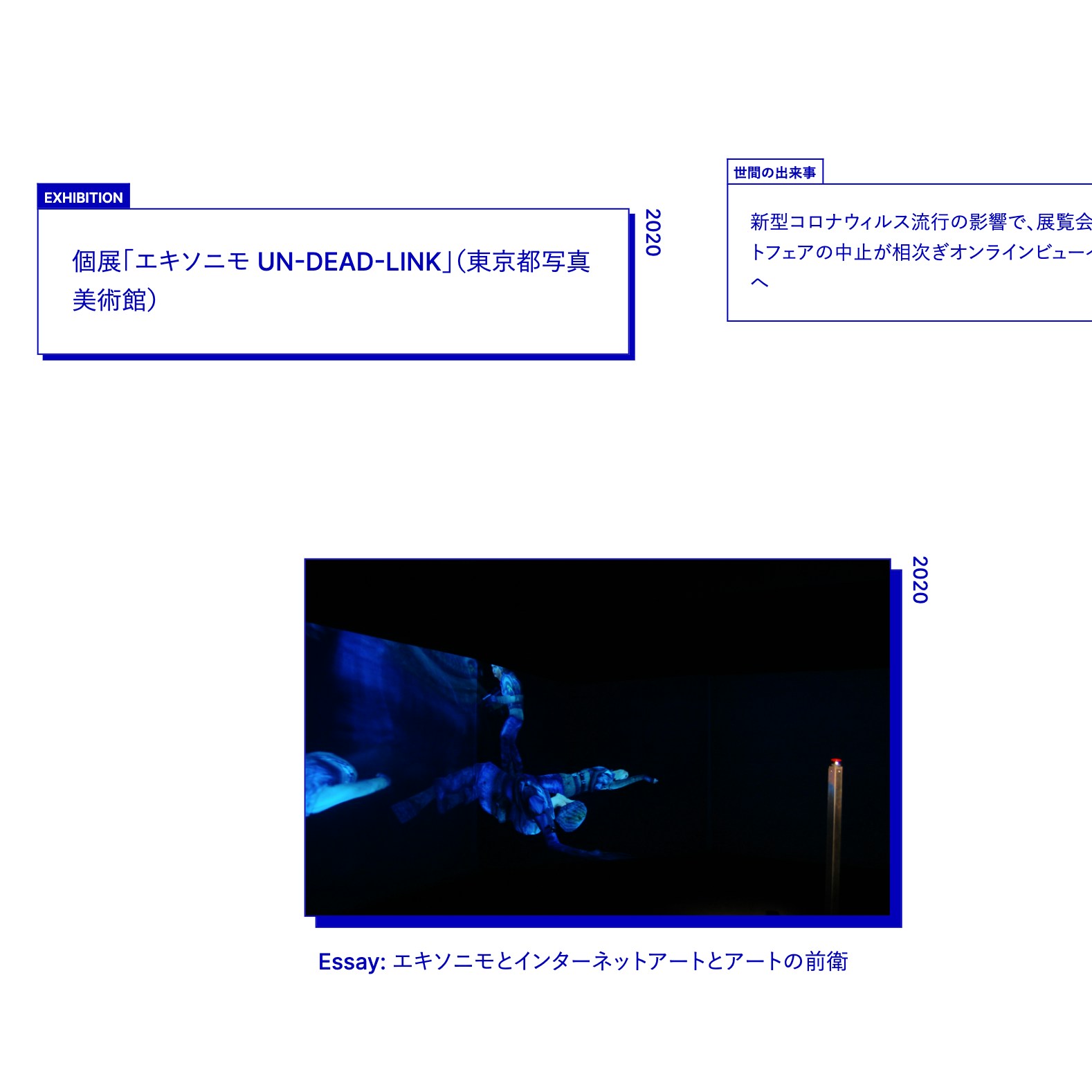 本展でもっとも注目したい点は、会場がネット上にも存在するということだ。ウェブ上に構築されたインターネット会場では、エキソニモ自身が本展のために作成した膨大な年表をもとに、作家による全作品解説や、作品の背景を理解するための様々なキーワードなどを見ることができる。