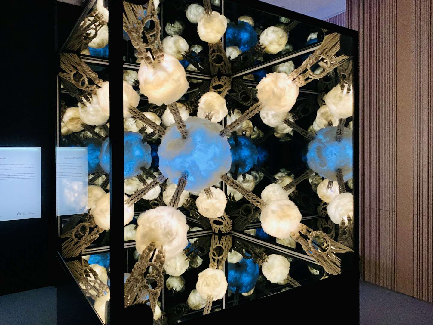 会場中央にあるのは、まさにロロ・ピアーナのクラフツマンシップを体現するようなインスタレーション《Infinite Connection》だ。ロロ・ピアーナのカシミアを紡ぎ、織った繊維とリンクさせた作品で、鏡張りの4面体のなかに設置することで無限の光景を生み出した。