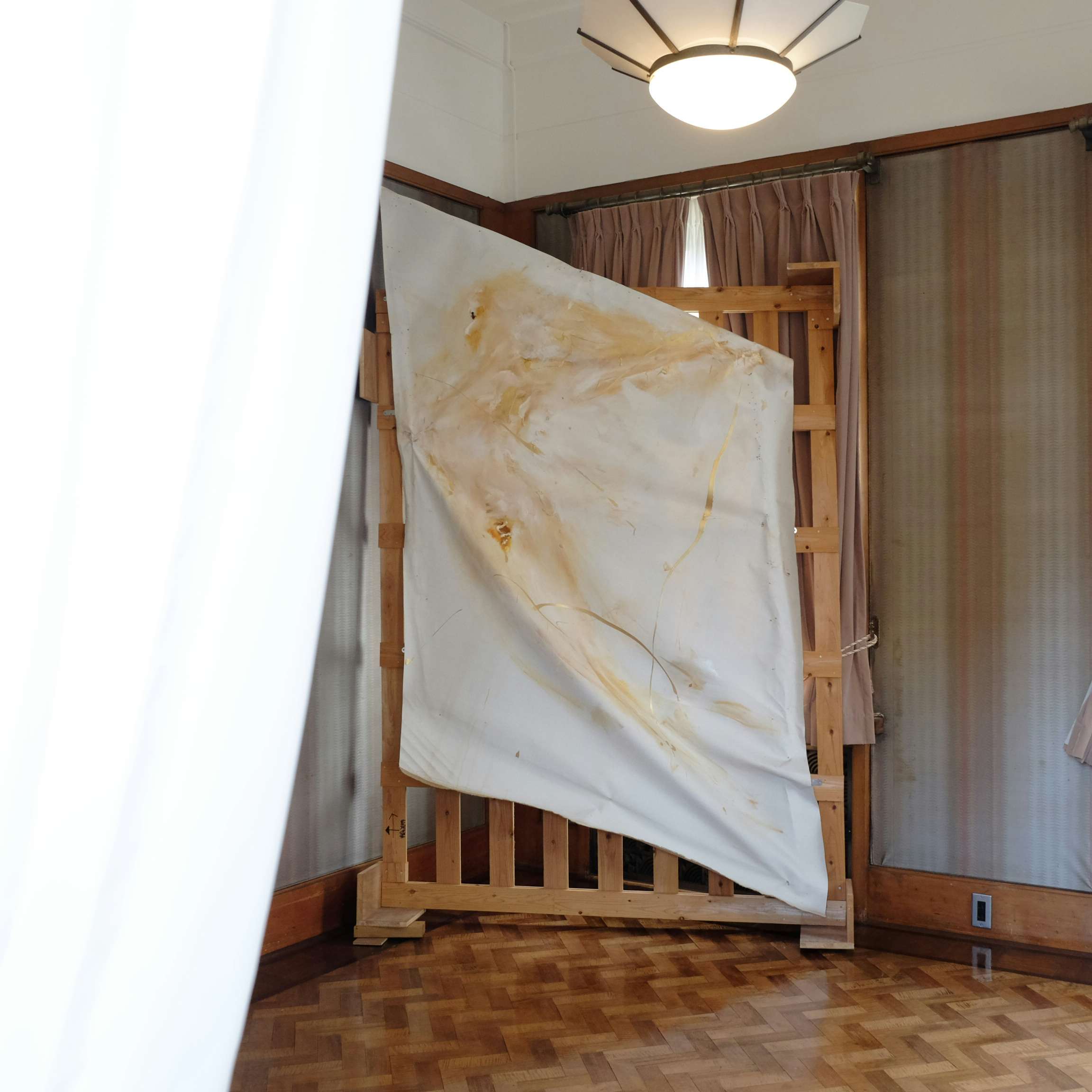 大きく円形を描いた張出し窓が特徴的な大食堂には8点の新作が展示されるほか、2階のベランダには2018年以降に加藤が制作に取り組んできた、絵画と彫刻を媒介するような布作品を展示。ほかにも、館内では思わぬところで加藤の作品が顔をのぞかせ、その多様な表現を堪能できるので、訪れた人はぜひ探してみてほしい。