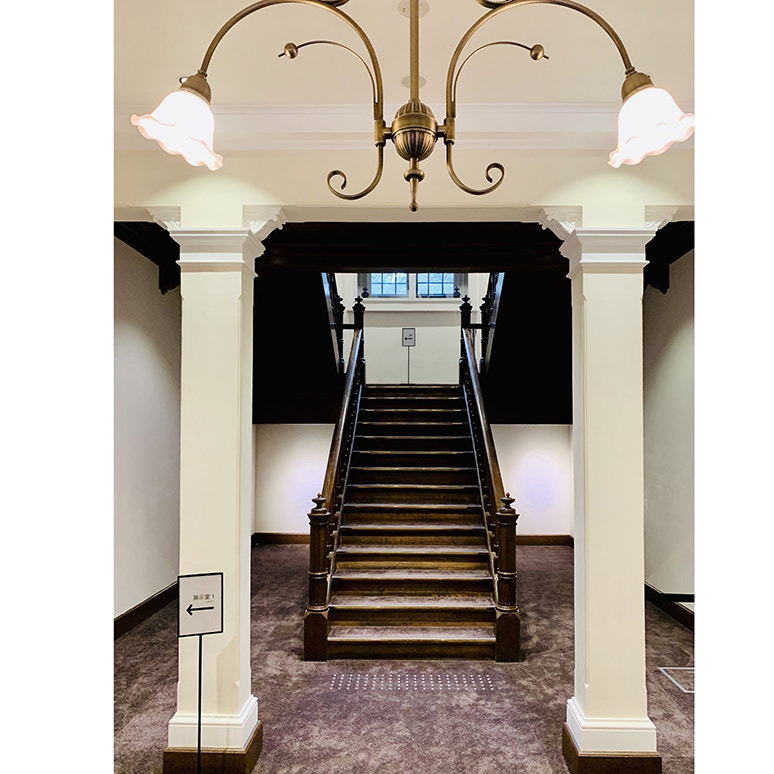 正面向かって右側の「旧金沢偕行社」部分は事務棟となっており、左側の「旧第九師団司令部庁舎」が展示室。来館者は中央のエントランスから入り、ショップとライブラリーを抜けて展示室へと向かう動線となっている。