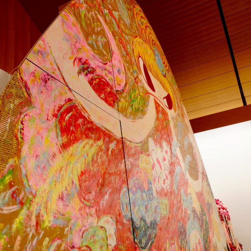 今回の展覧会は、千葉県立美術館の第3展示室と第8展示室で開催されている。まず、常設展示スペースを抜けると左手に見えてくるのが、三角形の屋根が特徴的な第8展示室だ。この展示室では膨大な数の作品が並んでおり、すべてが新作。なかでも、奥に据えられた巨大なペイント作品《Magic Hand》(2020)が存在感を放っている。
