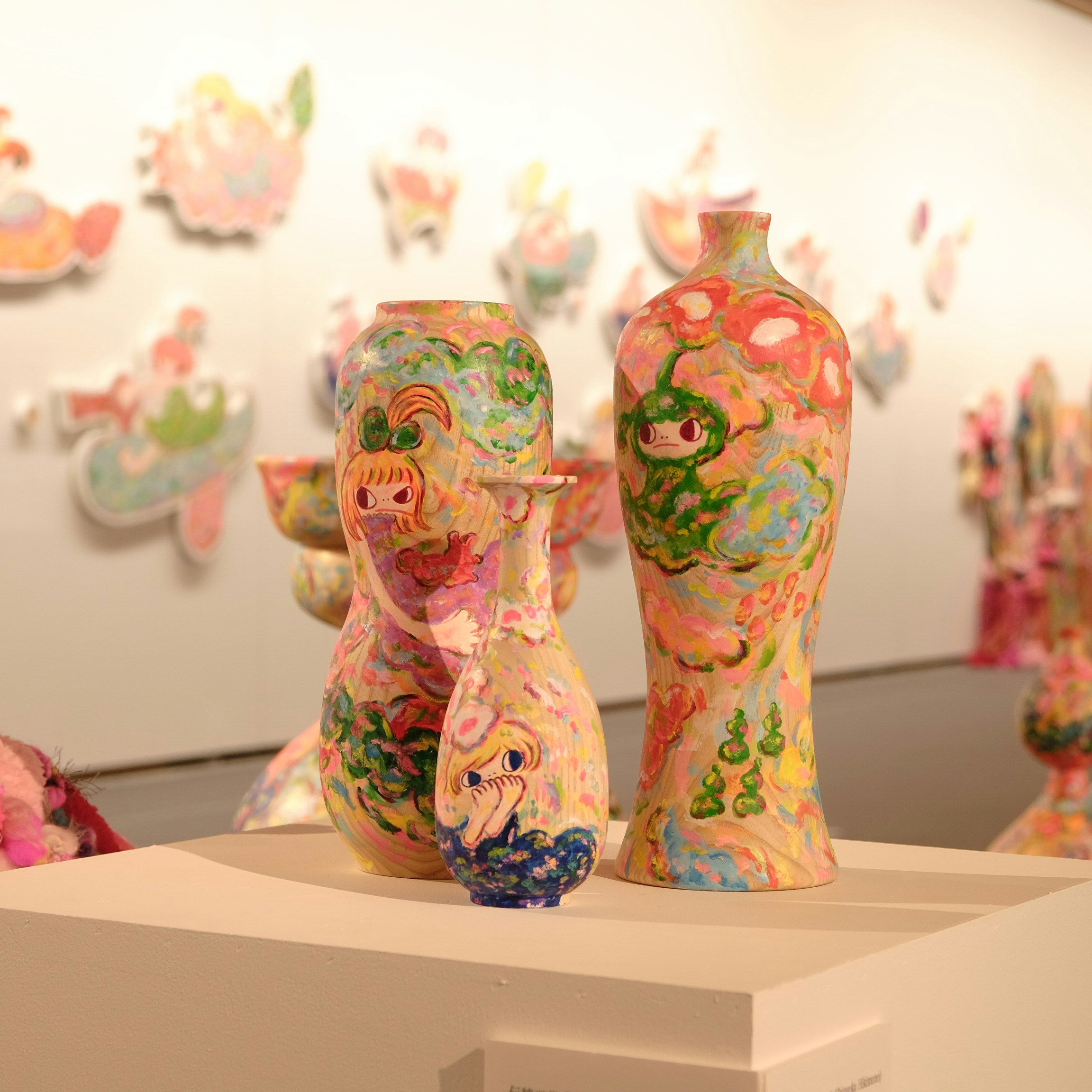 展示室中央に展示されているのは、木製の一輪挿しシリーズ「flower vase」だ。作品のベースとなった一輪挿しは、伝統工芸・静岡挽物のブランド「SeeSee」によるもので、ろくろや旋盤を用いてタモ材を成形している。器胎の周囲にカラフルな色彩で描かれた「女の子」は、平面作品とはまた異なる新鮮な構図を見せている。