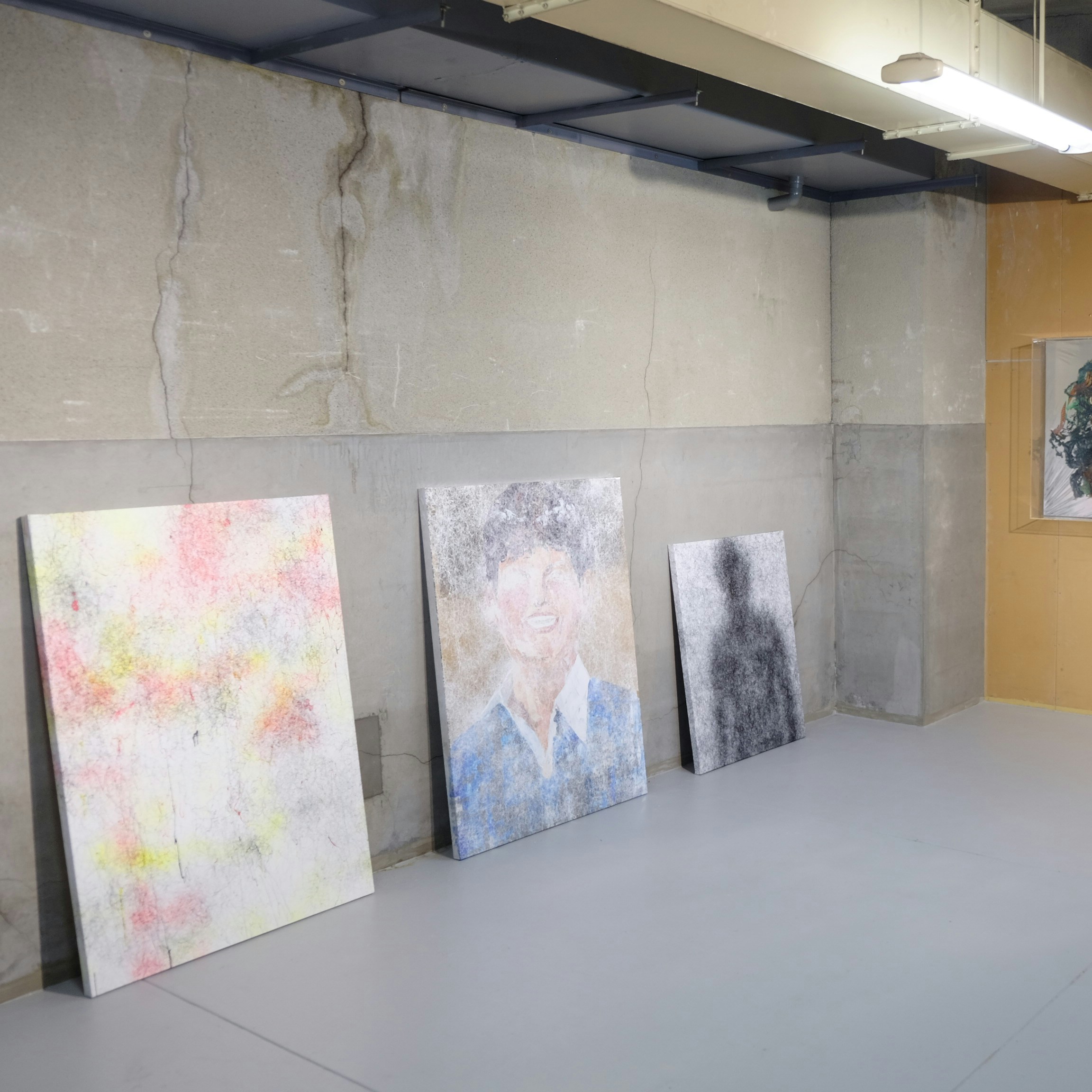 「ソノ アイダ#有楽町」は、国際ビルヂング1階のエントランス付近にある、ガラス張りの空き店舗空間で実施されている。ここで、藤元、藤崎、相澤それぞれが作品制作を実施。出来上がった作品は壁に展示され、訪れた人が購入することも可能。作家のアトリエを訪れて作品を購入するという体験を、オフィス街の中心で味わうことが可能だ。