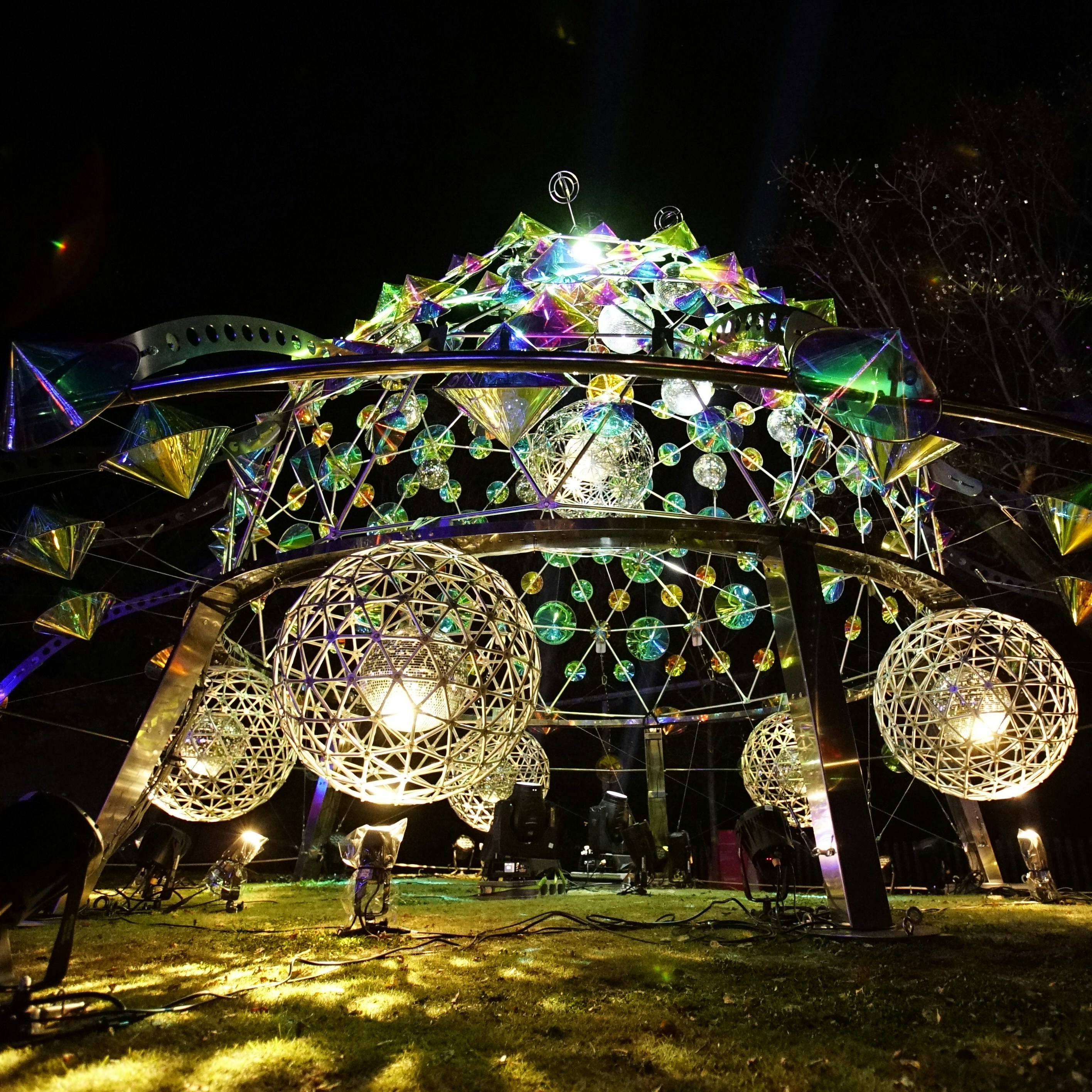 観覧車の後方では、ミラーボールを使って光と反射の空間作品をつくりだすアート集団・ミラーボーラーによるUFO状の巨大作品《Close Encounter 369》が輝く。山口県のカルスト台地・秋吉台では、UFO(未確認飛行物体)が度々目撃されているという。大量のミラーボールでできた無数の光や色を放つ本作について、ミラーボーラーは、「UFOを呼べたらいいなと思って、それを楽しみにしている」と冗談めかして語る。