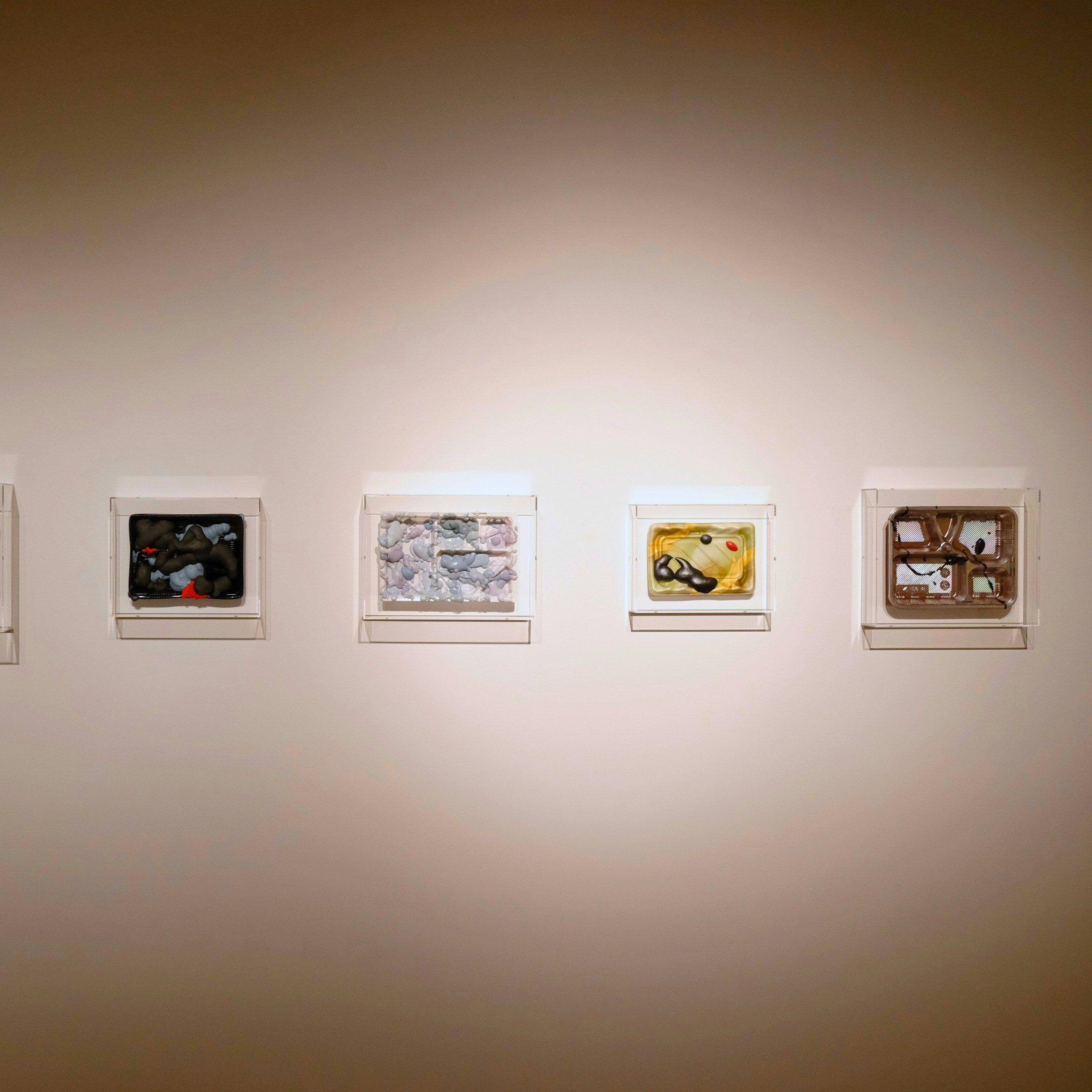 会田誠の「ランチボックス・ペインティング」シリーズ(2016)にも注目したい。市販の使い捨ての弁当箱の容器に、着色した発泡ウレタンを配置して構成された抽象作品を並べて見ることができるのは、会田の作風や思考がいかに時代と呼応してきたのかを考えるうえでも貴重な機会だ。