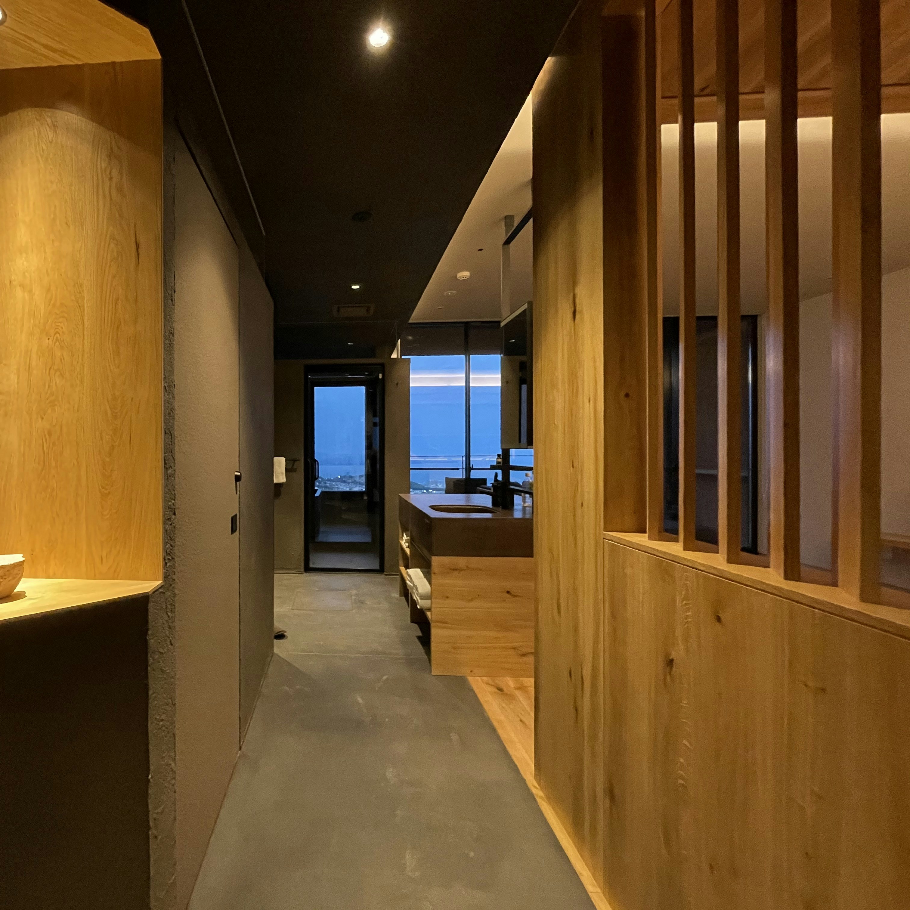 建築の外観は、断層崖に連続する「削り出された大地」としての壁の群れや、それに穿たれた孔が特徴的だ。館内にはカフェ・バー「HOT SPRING BAR」や4つのテラススペースがパブリックゾーンとして設置。また、客室全35部屋には天然温泉半露天風呂が備えられており、テラスからは別府の湯けむりの町並みや別府湾の遠景を一望することができる。