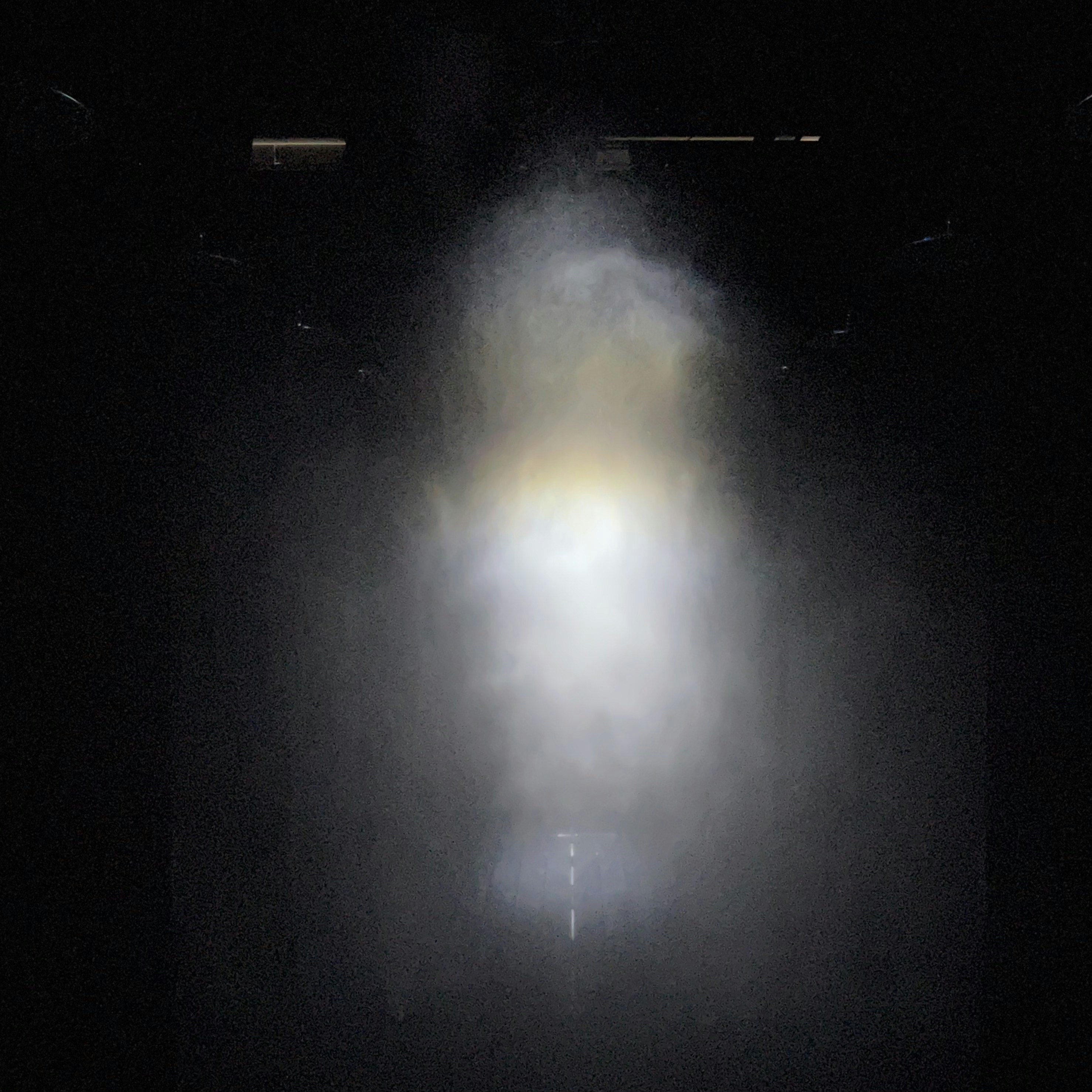 サウナ室と冷水シャワーを繰り返し、2番目の作品を見てみよう。《生命は結晶化した儚い光》と題された新作は、空間内にある無数の水の線に光が結晶状になり、空中に浮遊するもの。身体ごと作品空間に没入すると、身体に触れた光の結晶は壊れてしまう。生命の脆弱さを想起させる作品だ。