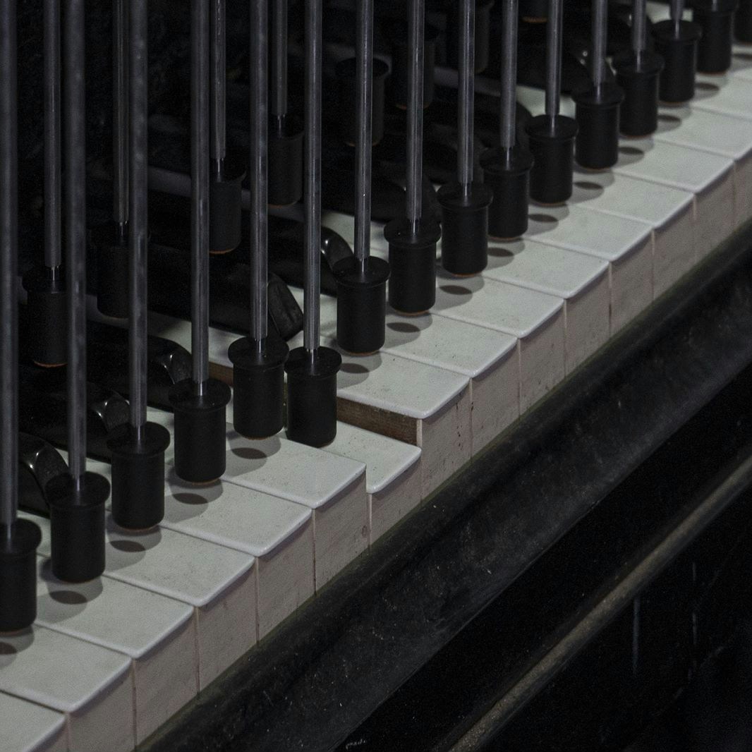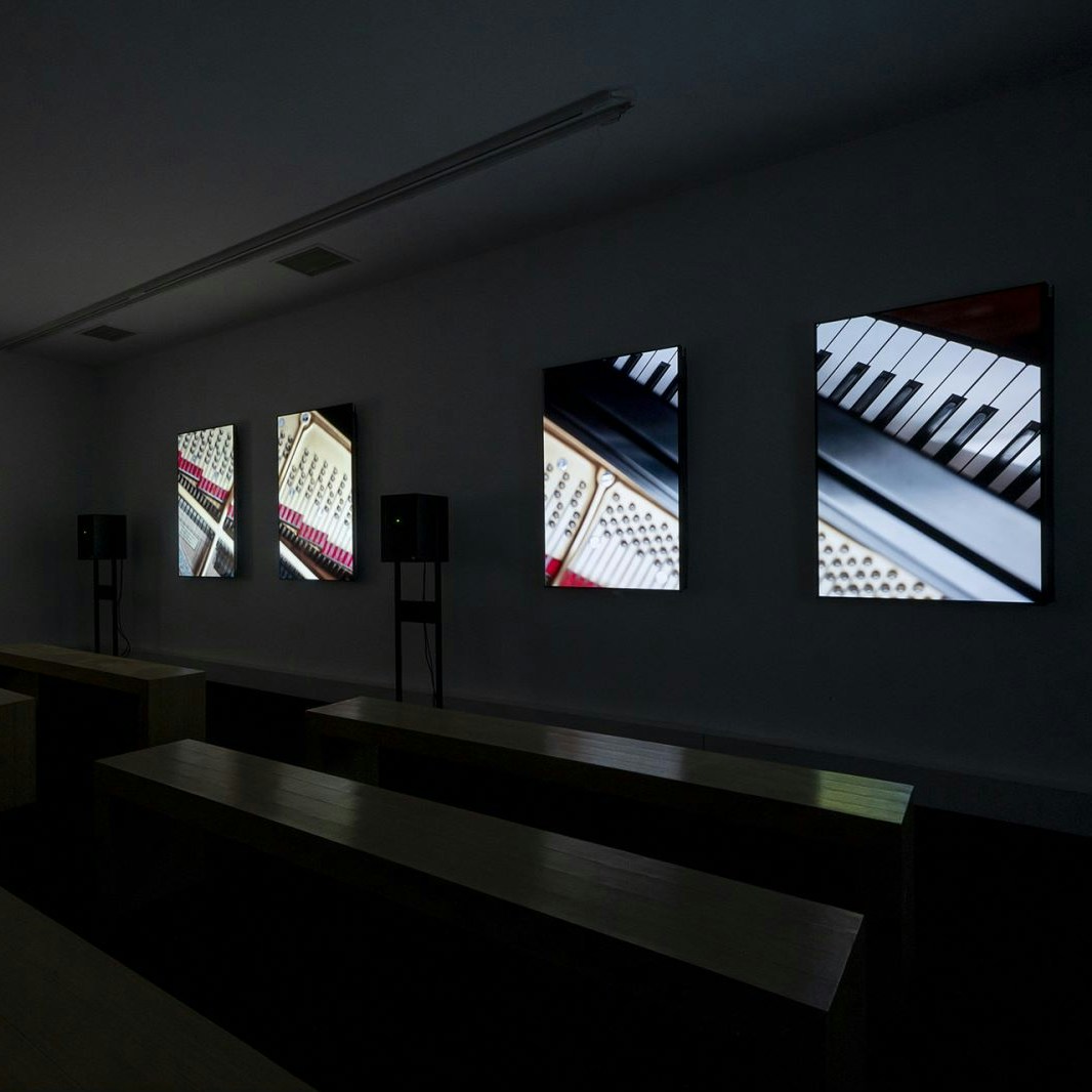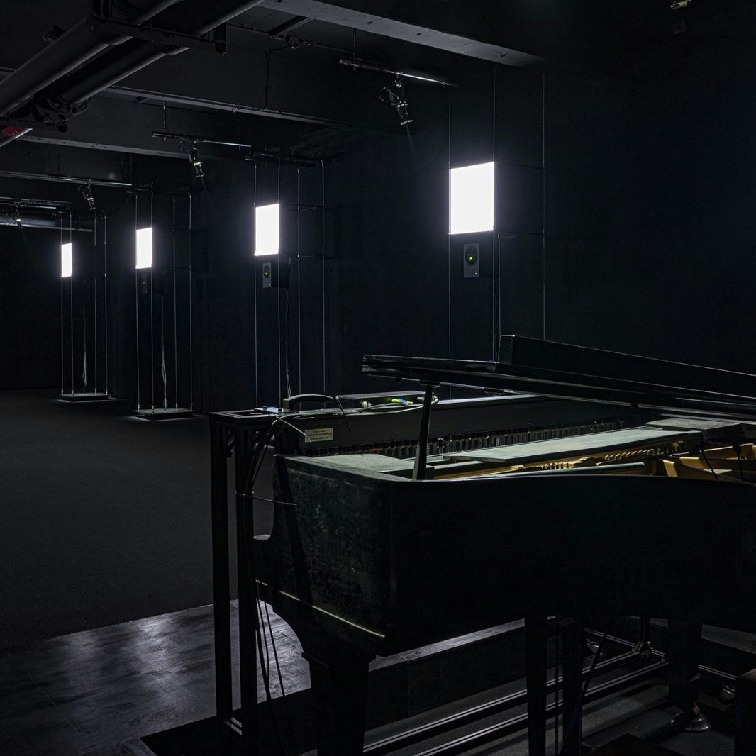 両側の壁に設置されたモニターとスピーカーに挟まれている1階の展示室の突き当たりに、ピアノは静かに佇む。坂本と高谷史郎の共同制作によるサウンドイスタレーション《IS YOUR TIME》(2017)は世界各地で計測された地震データと連動し、ピアノの鍵盤部分に自動打鍵機をとり付けることで自動演奏させるもの。自然という存在が近代を象徴する楽器であるピアノを通じてたんなる物質へと還元され、地震という地球の鼓動から伝わってくる音はじつに凄まじく強烈である、というメッセージを伝えている。