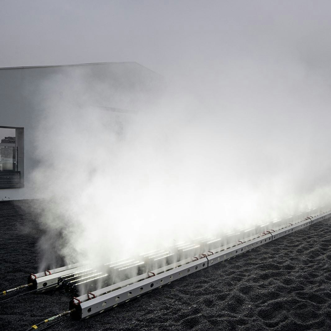 2階と屋上に展示されている作品《LIFE - fluid, invisible, inaudible…》(2007/2021)《water state 1》(2013)《LIFE-WELL Installation》(2013/2021)は、いずれも水と霧を視覚的な要素で表現したもの。坂本の観念の世界においては、水は自然や生命にとってかけがえのない存在であり、これらの作品は彼が敬愛するタルコフスキー監督への表意だという。不意に現れる室内の雨や水に満たされた廃屋、夜明けの霧隠れなど、タルコフスキーの映画のなかに潜めた繊細かつ深遠なる象徴は、坂本の作品にも引き継がれている。