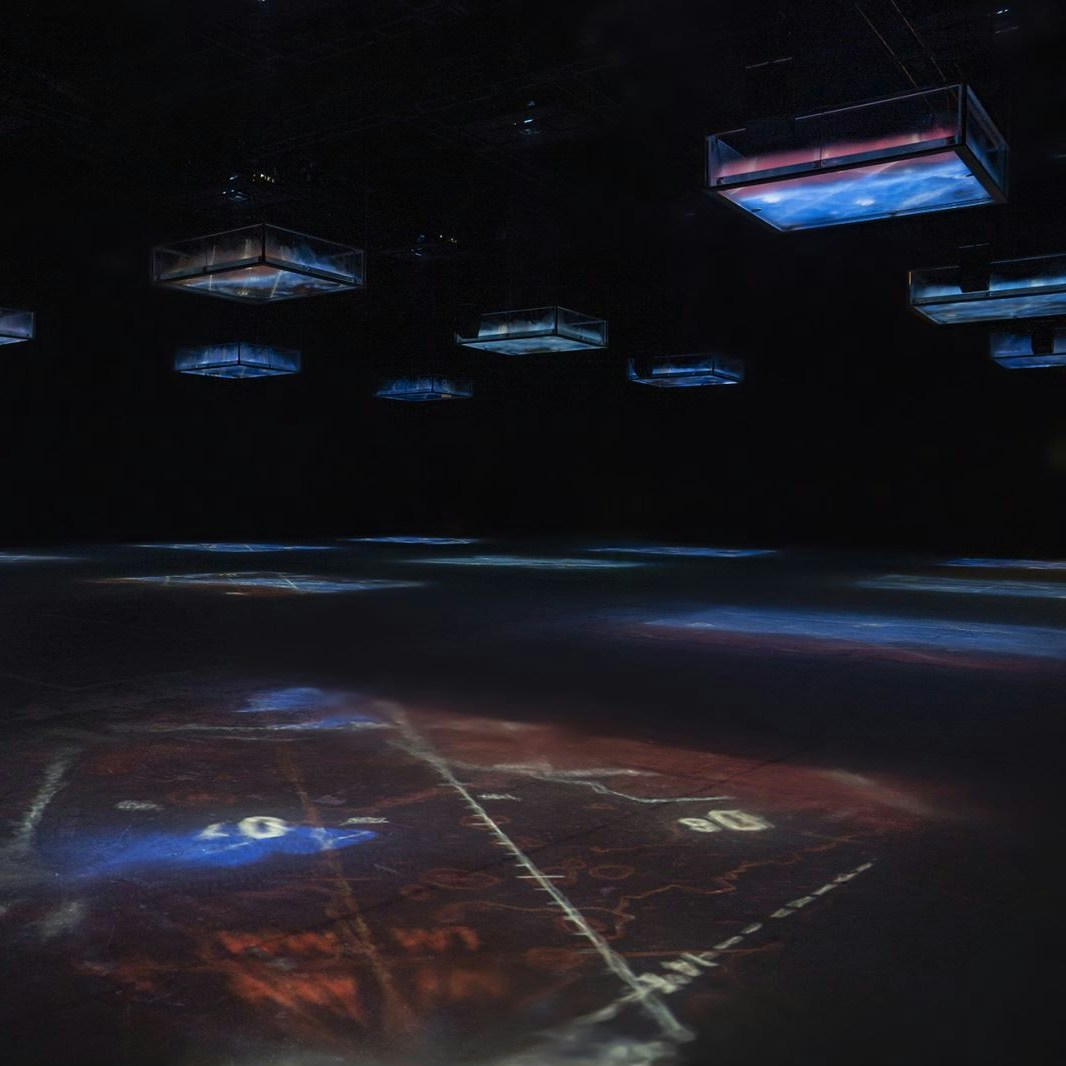 《LIFE - fluid, invisible, inaudible…》は、真っ暗の空間に3×4個のグリッド状の霧の箱が屋根から吊られ、光が箱を通して地面を照らし、箱の下の正方形の床がまるで水に浸されたように見えるインスタレーション。波紋は音とともに広がり、重なり、流されていく。これらの箱は、水が薄く張られたアクリル水槽の内部での超音波を通じ、人工的な霧を発生させる。霧が透過するときであれ不透過であるときであれ、水と音の織りなす不穏なパターンのなかに自然界の小さな不確実性が生みだされ、「非同期」が集積するように光は差異と反復のあいだを行き来し続ける。