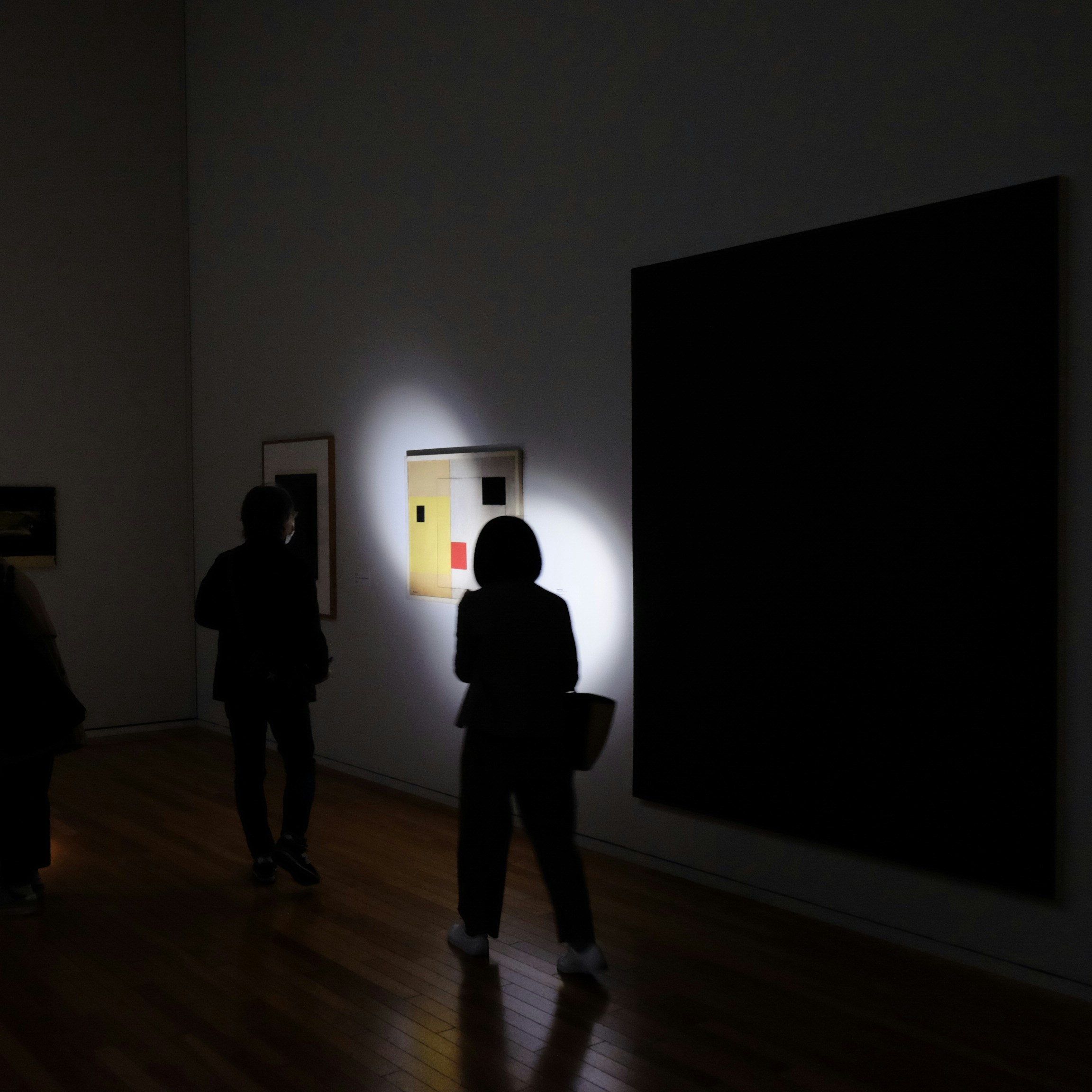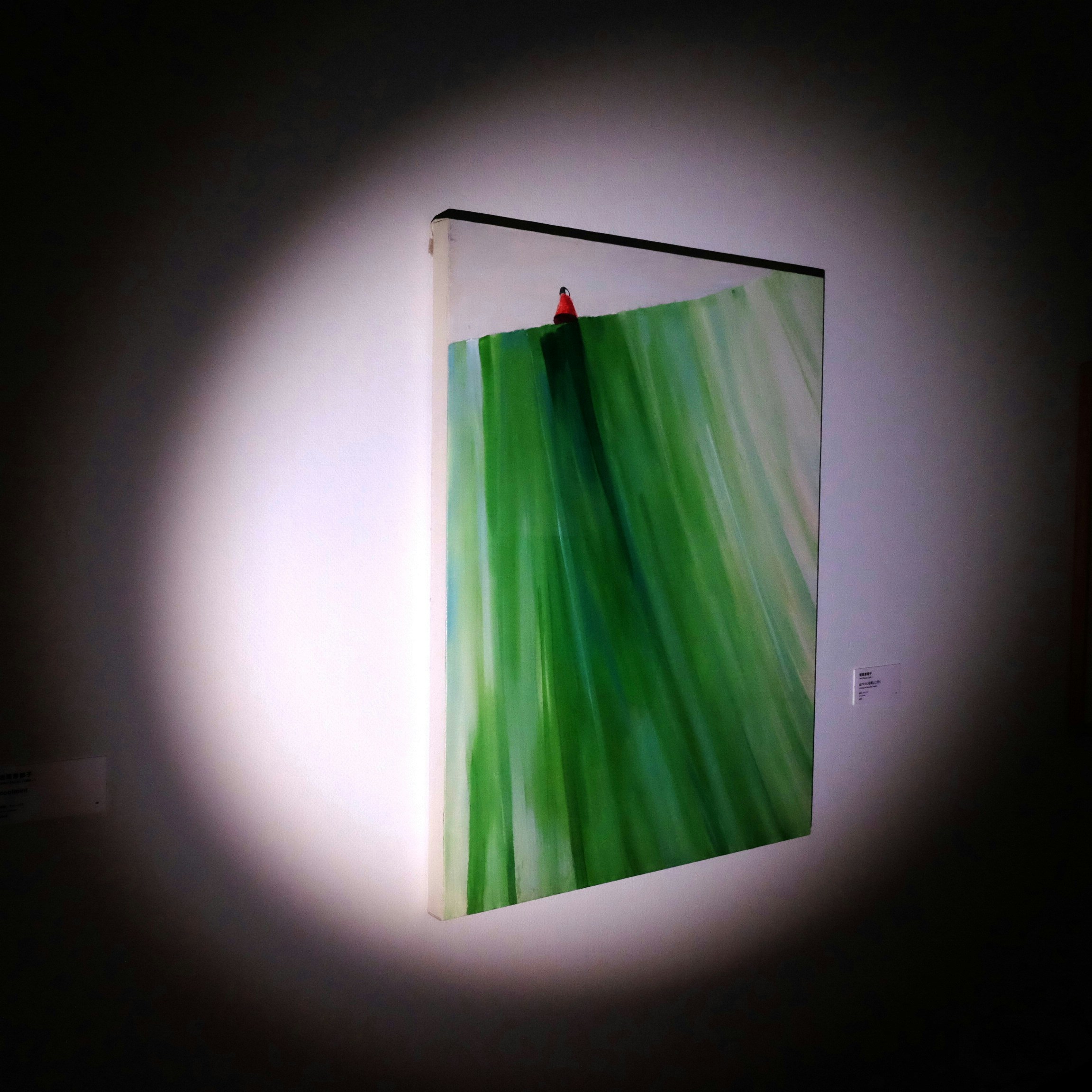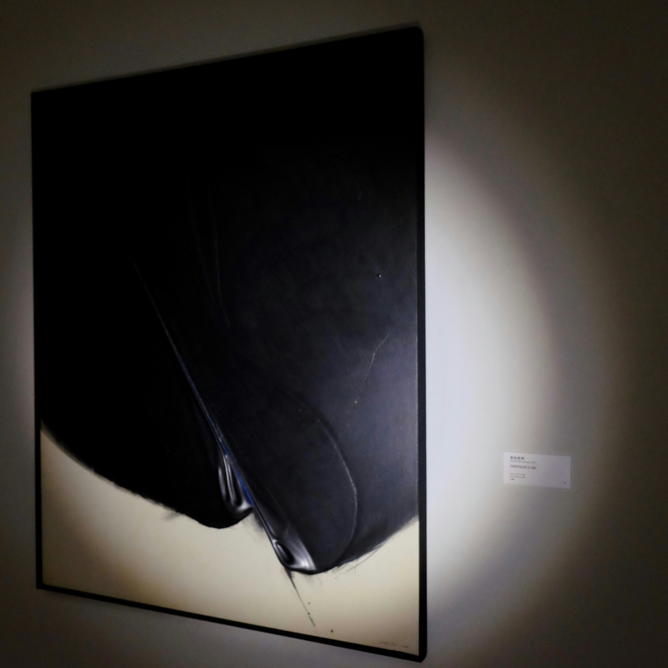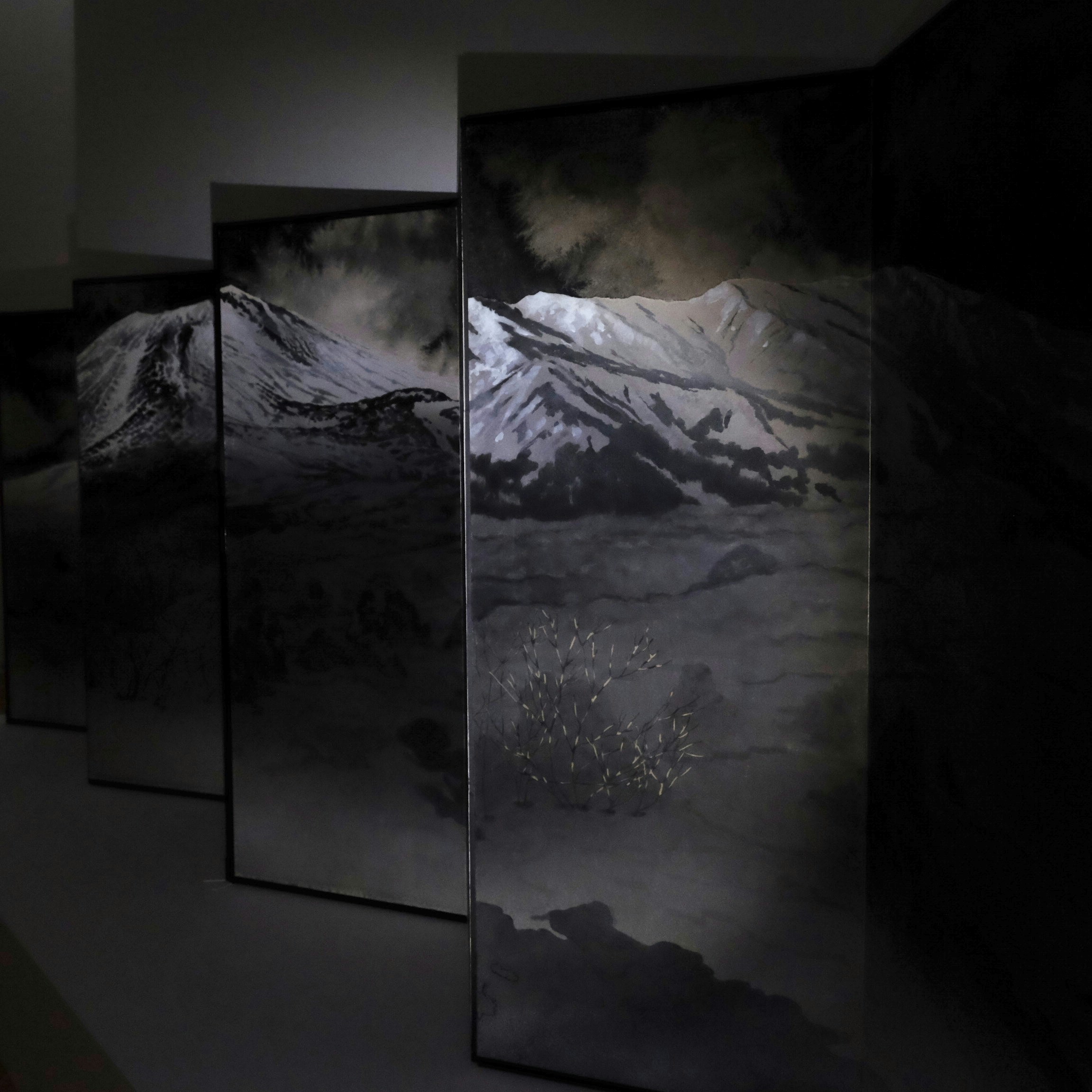 4つ目の章となる「PANORAMA パノラマ」では比較的大型の作品が展示される。一度にライトで照らせる範囲には限界があるため、大型作品の全体に光を当てながら観覧することは難しい。結果的に部分をスポットライトを当てるように見ていくことになる。並木功や大野俊明の屏風絵や李禹煥の大型絵画などの全体像を、細部からとらえるという稀有な体験ができる。これも、ガンダーの狙いなのかもしれない。