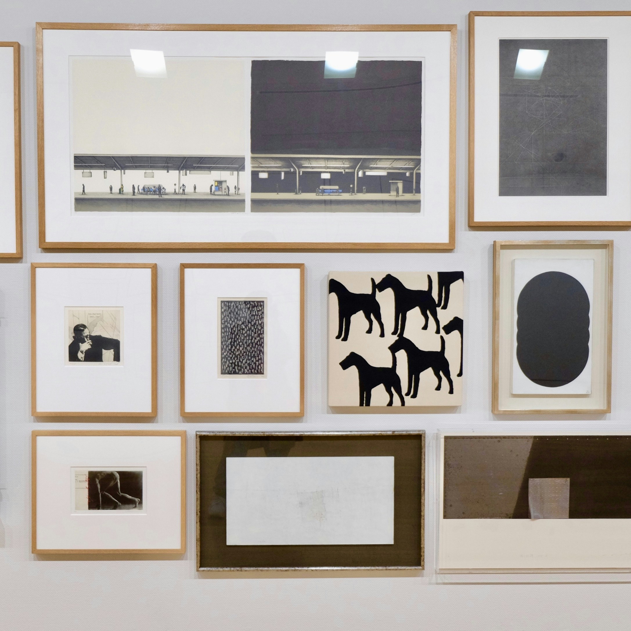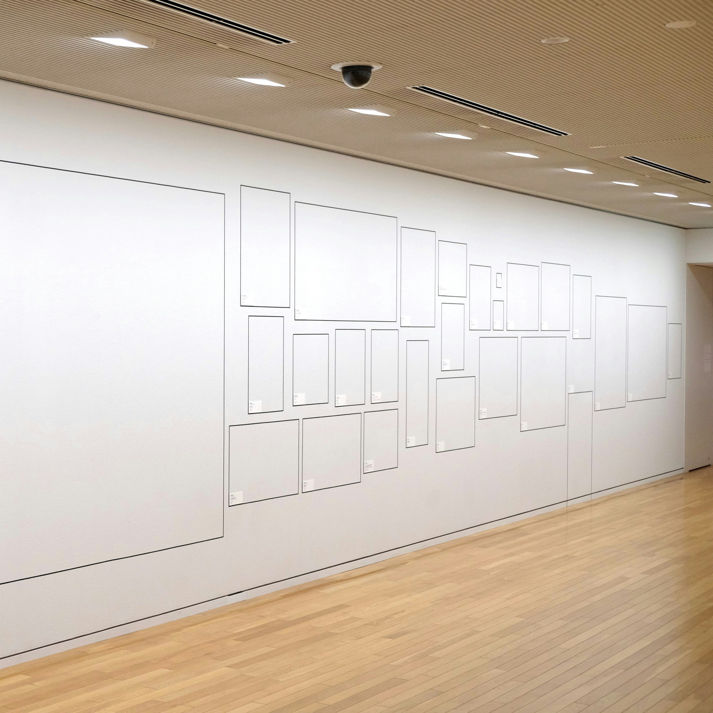 4階の「色を想像する」では、所蔵品のなかから白と黒のモノトーンの作品のみが展示された。壁一面に敷き詰めるように作品が掛けられ、反対側の壁には各作品の情報が対になるように実寸で掲示されるという、独特の展示方法だ。
