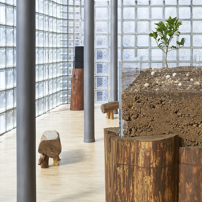 展示風景より、フィル・ニブロックによる6つの楽曲、福岡正信自然農園の土・甘夏の苗、木の台座、スピーカー、木のプランター、アクリルケース、水、太陽光 (C) Nacasa & Partners Inc. / Courtesy of Fondation d'entreprise Hermès