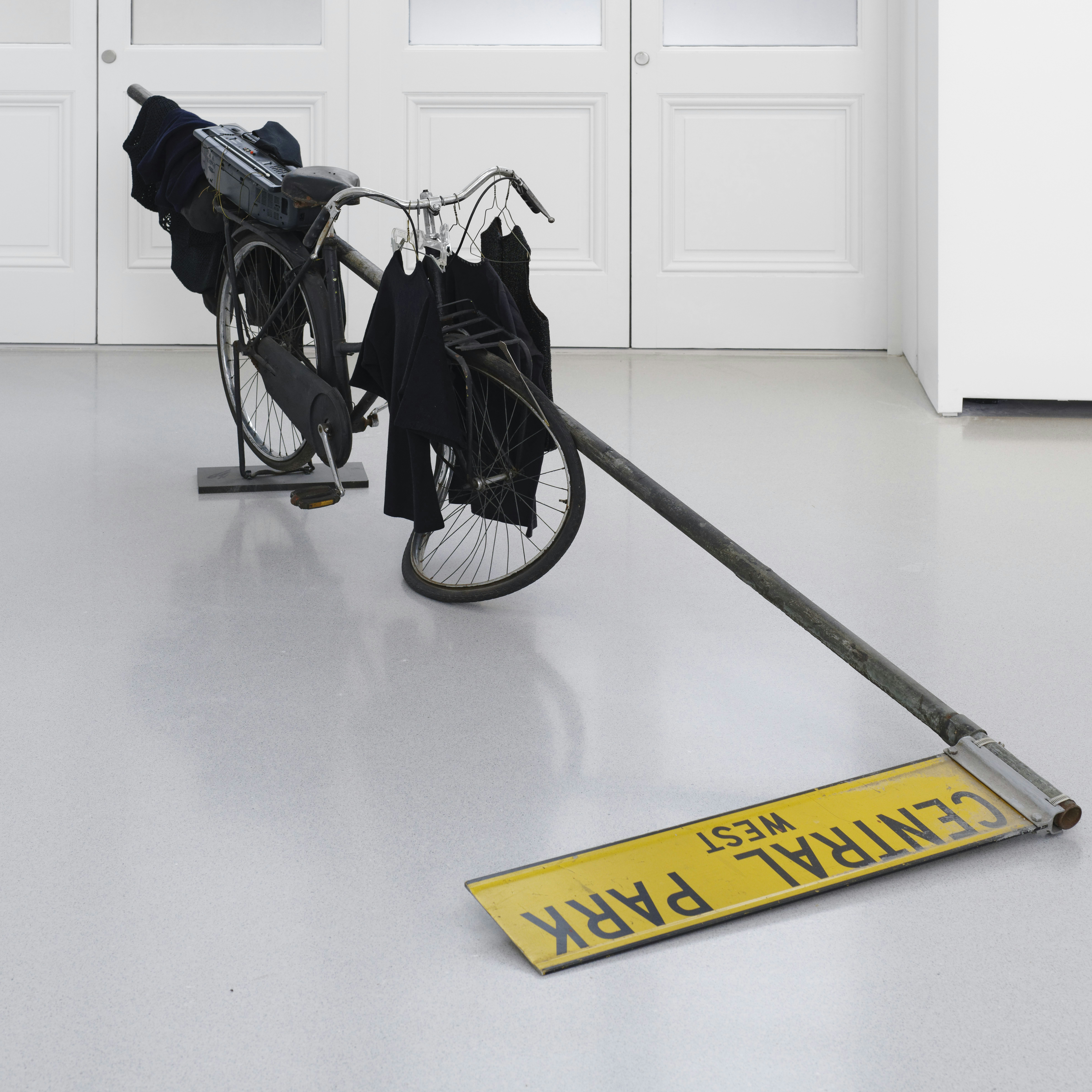 会場には裂け目を入れて色を変えた星条旗《Oh say can you see》(2017)や、壊れた自転車と折れた標識でできたコート掛け《Central Park West》(1990)などが並ぶ。これらの作品は、その場所にたまたま生まれただけで、損耗し烙印でも押されたような存在に見える。同時に、疎外されるために見えにくく強制された沈黙ゆえに届かない声を聞こうとするようにも見える。《Minimum Seculity》(2007)では、ブルス・ドゥ・コメルスの一室に貼られた19世紀後半の世界との貿易の歴史を示す地図の前に、鉄製のケージ、石、鍵の束などが置かれた。その時代がちょうど西洋の植民地拡大の真っ只中にあったことを不気味に思い出させる。