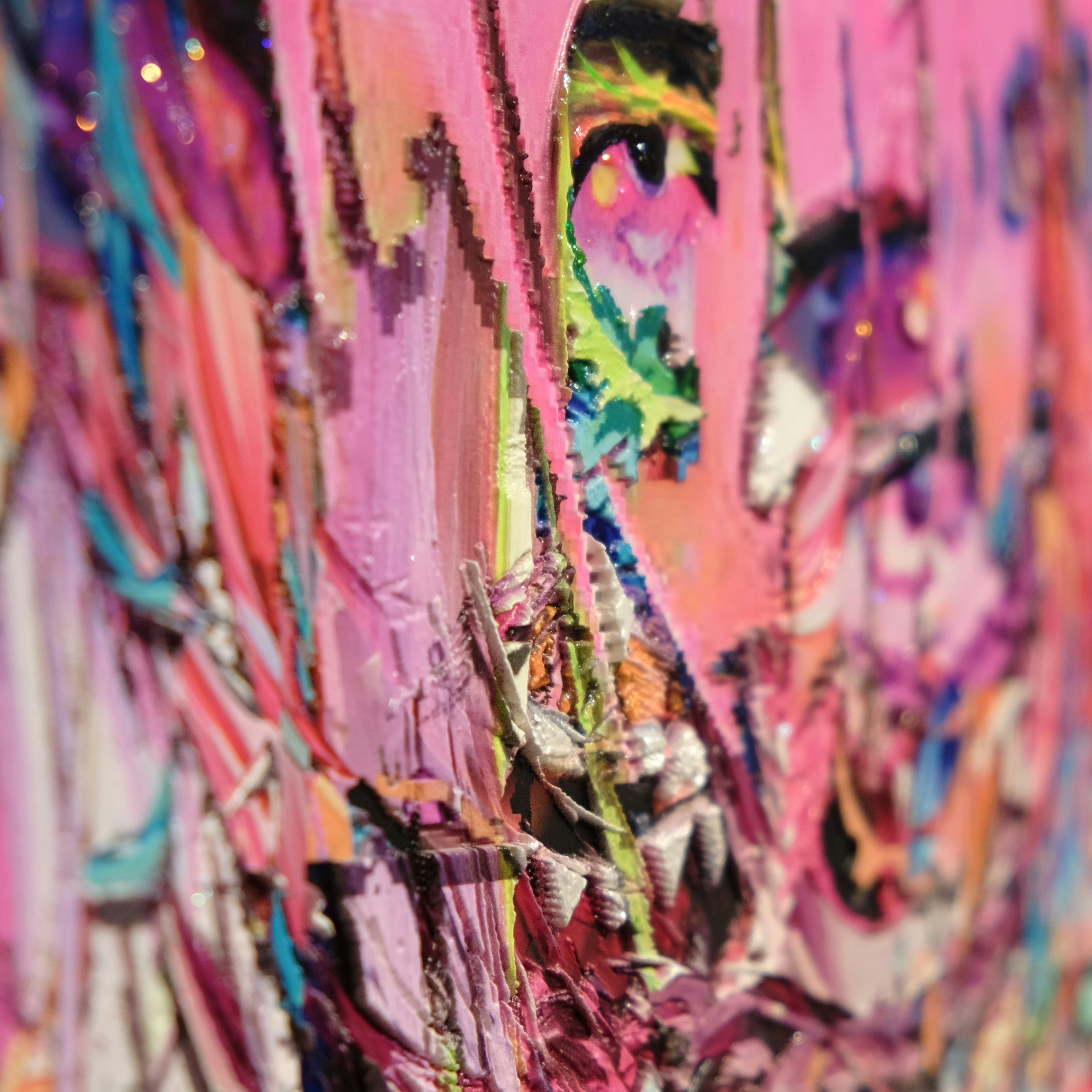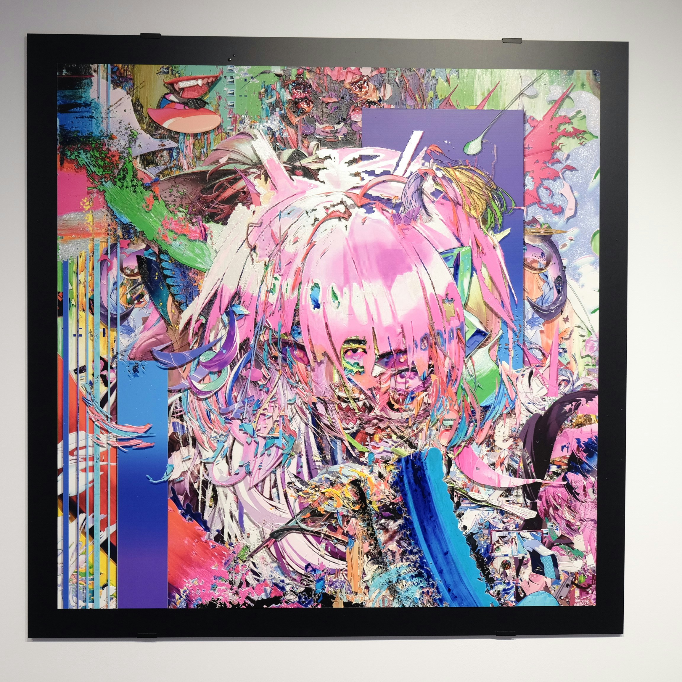 これまで、インターネット上に存在する画像データなどをコラージュし、ときにはペインティングを重ねながら、デジタル画像を現実の物質として定着させる試みを行ってきた梅沢。今回は「StareReap」の技術を使用し、いくつものレイヤーが積層したフォトショップのデータをベースに、各層の高さなどを調整しながら立体的にプリント出力。そこにペイントを施すことで、作品をつくりあげた。