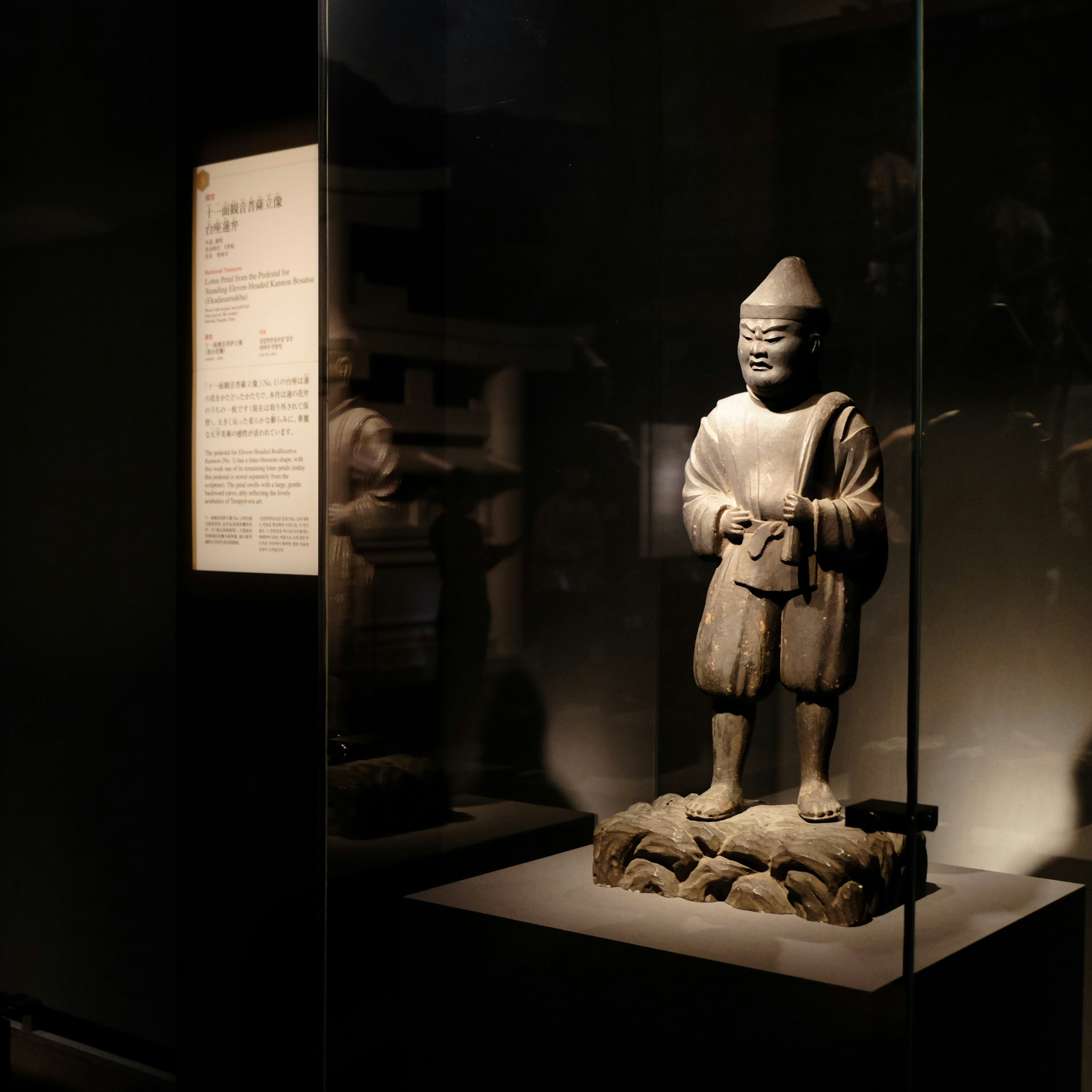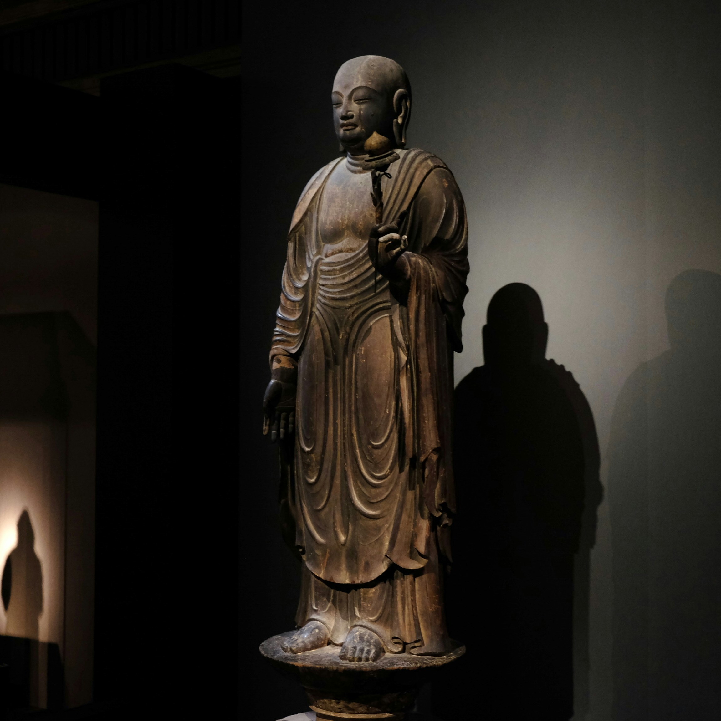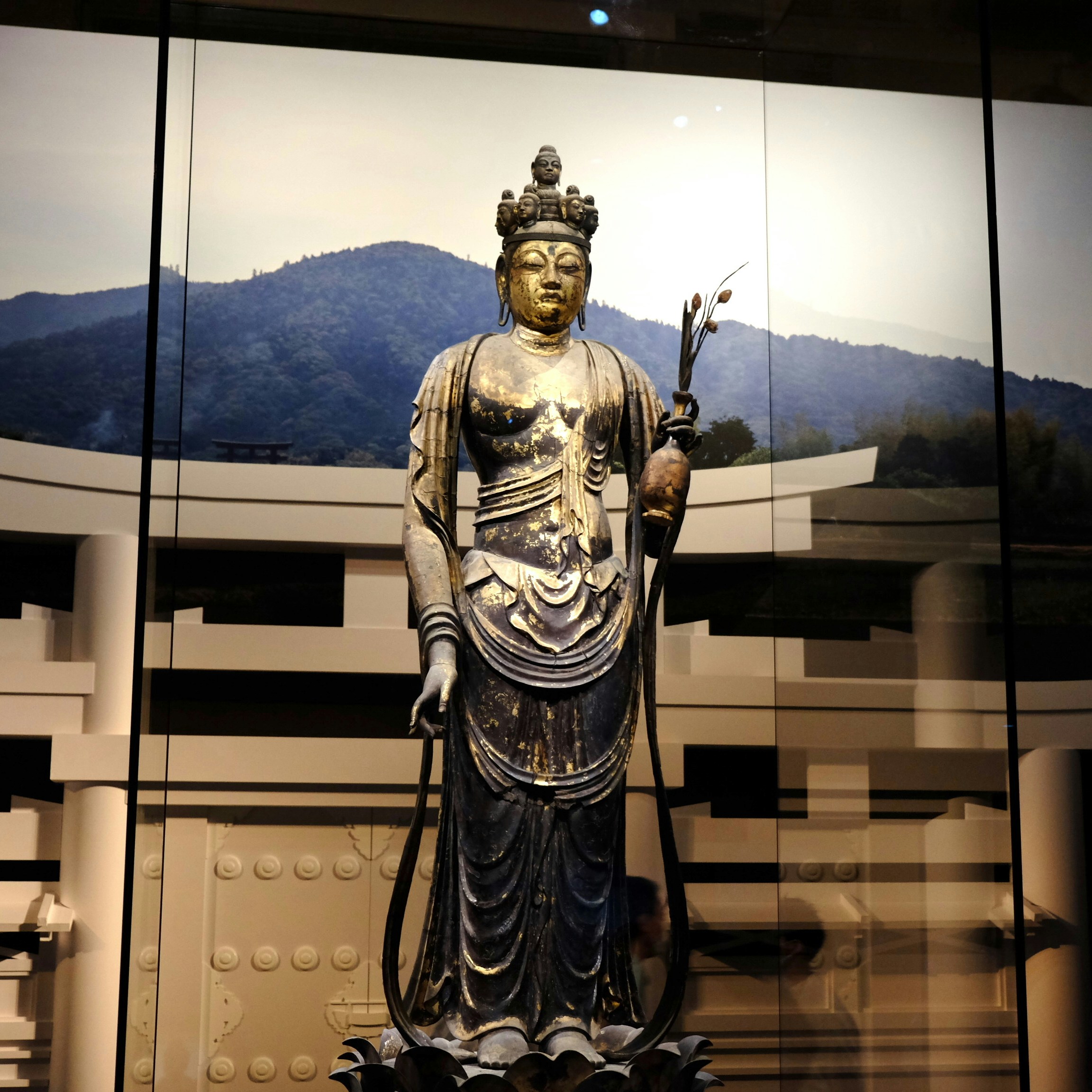 展示会場では、本展の主役となる《国宝 十一面観音菩薩立像》が中央に鎮座している。同像は、明治政府の神仏分離の政策により1868年に大御輪寺から聖林寺に移され、現在にいたるもの。奈良の外で展示されるのは初めてとなる。