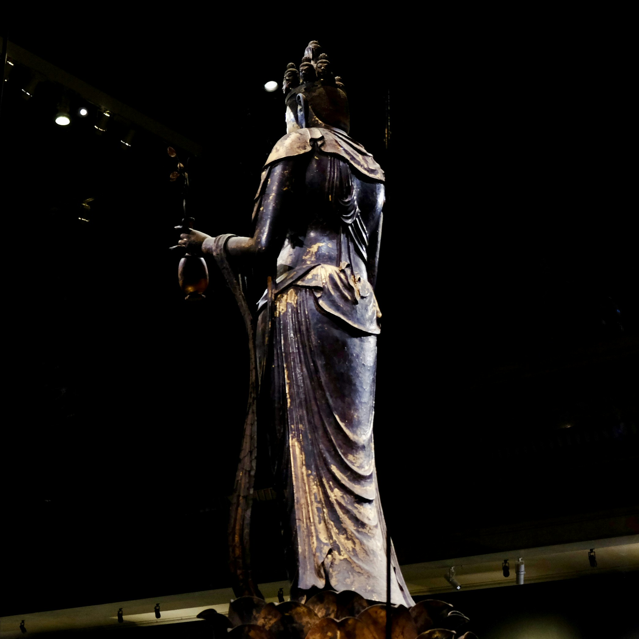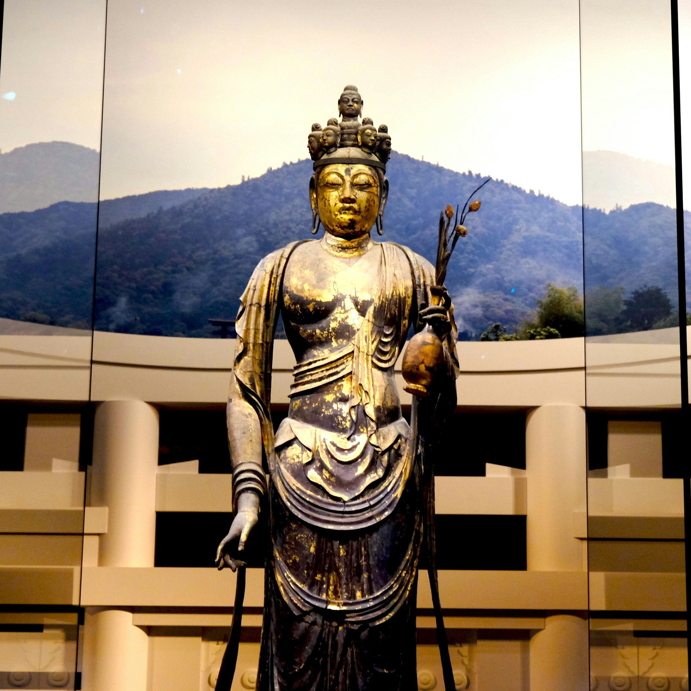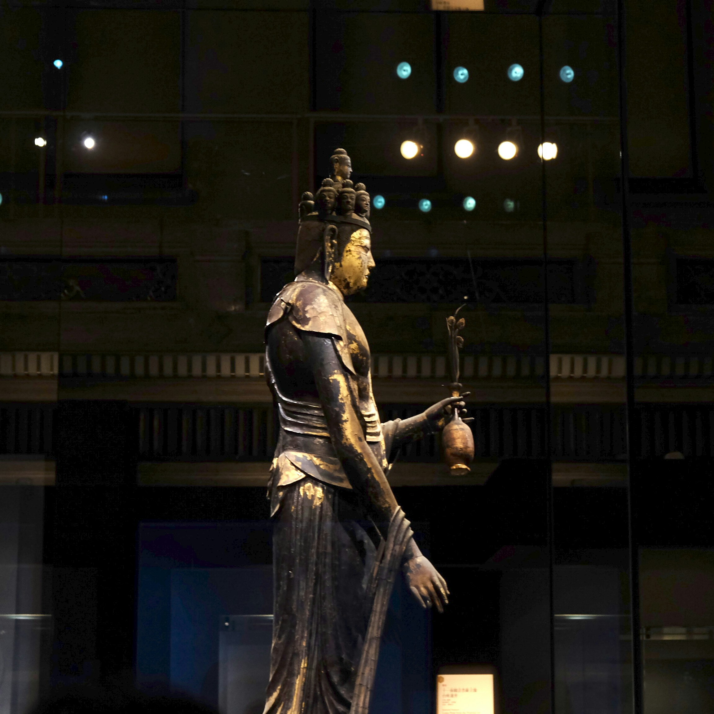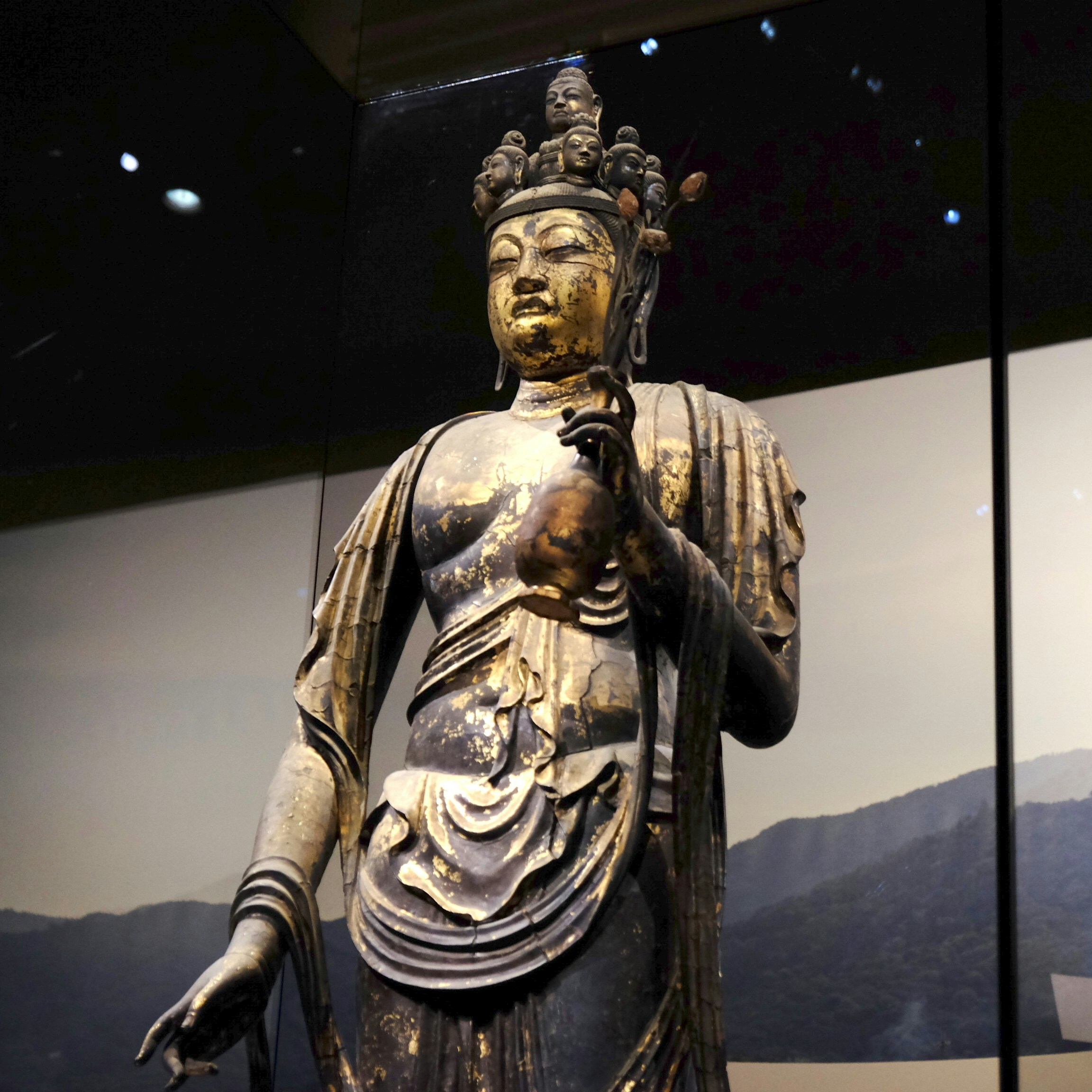 観音菩薩は日本で古くから信仰を集めてきたが、なかでも顔や腕が複数ある「変化観音」は密教の思想との関係から生み出された。十一面観音もそのひとつで、その名の通り頭上に11の顔があり、すべての人々を救済するようにあらゆる方向を見渡す。現在の《国宝 十一面観音菩薩立像》は計8面のみが残る。