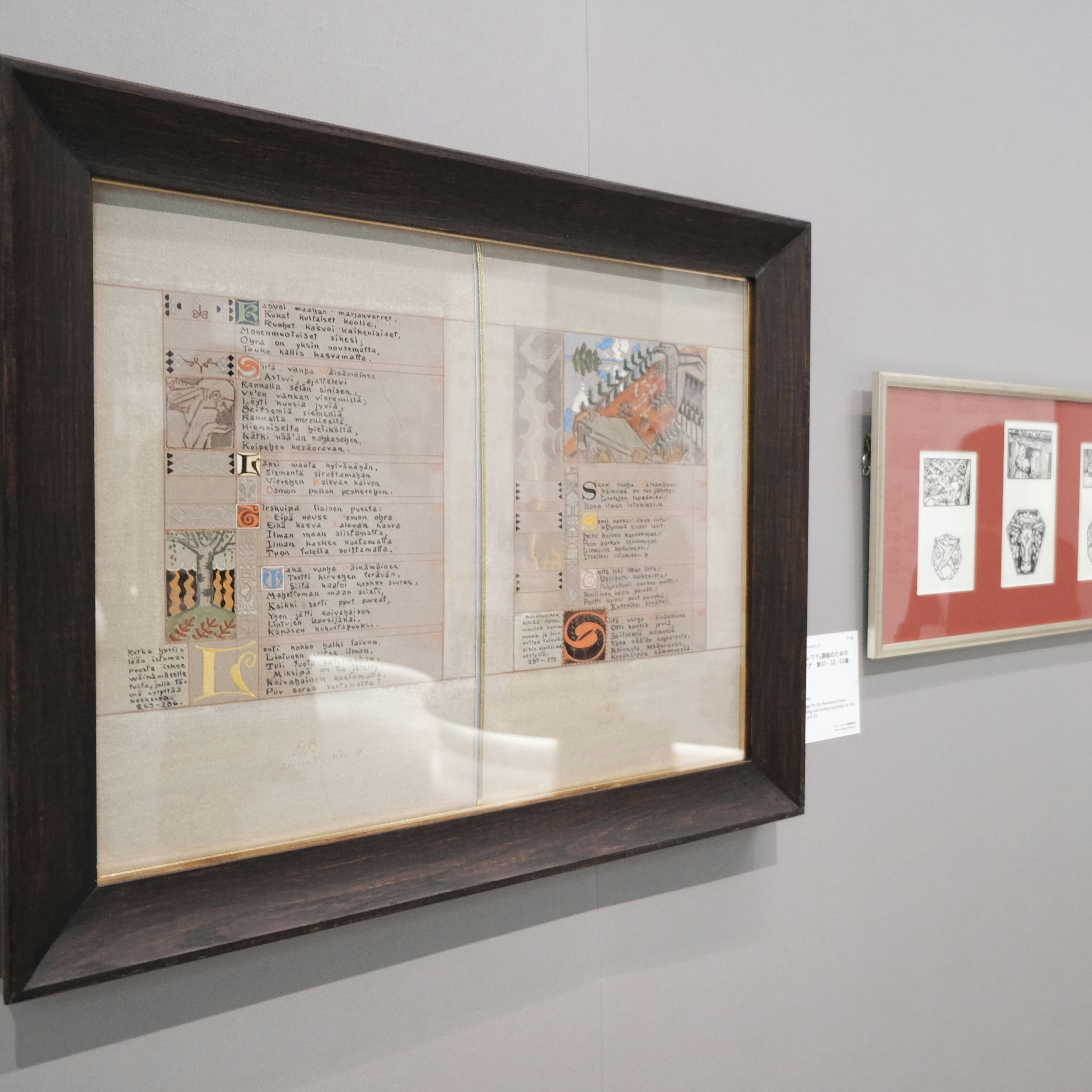展覧会の冒頭では、まずフィンランドの民族叙事詩『カレカワ』にまつわる書物や絵画が展示される。サーリネンがフィンランドで活躍した時代は、1917年のロシアからのフィンランド独立に向けて、民族意識が高まった時期と重なる。こうした民族主義的な潮流のなかで、『カレカワ』は国民の連帯意識を醸成するものとして評価され、様々な創作物が生まれた。展示からは、サーリネンの建築やデザインを学ぶうえで重要な、フィンランドの民族意識の一端を知ることができる。