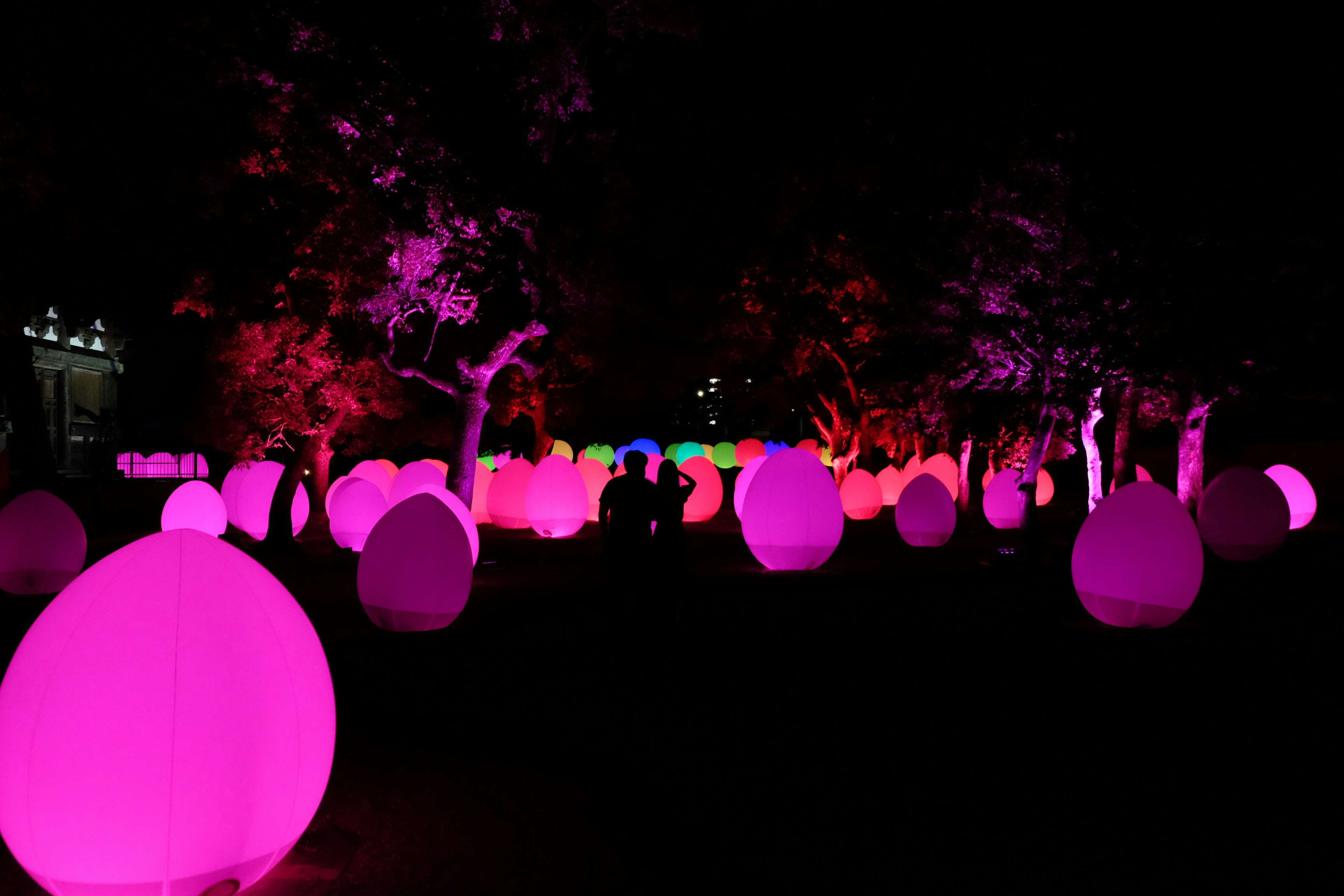 展示風景より、五重塔と《瓢箪池に浮遊する呼応するランプ》