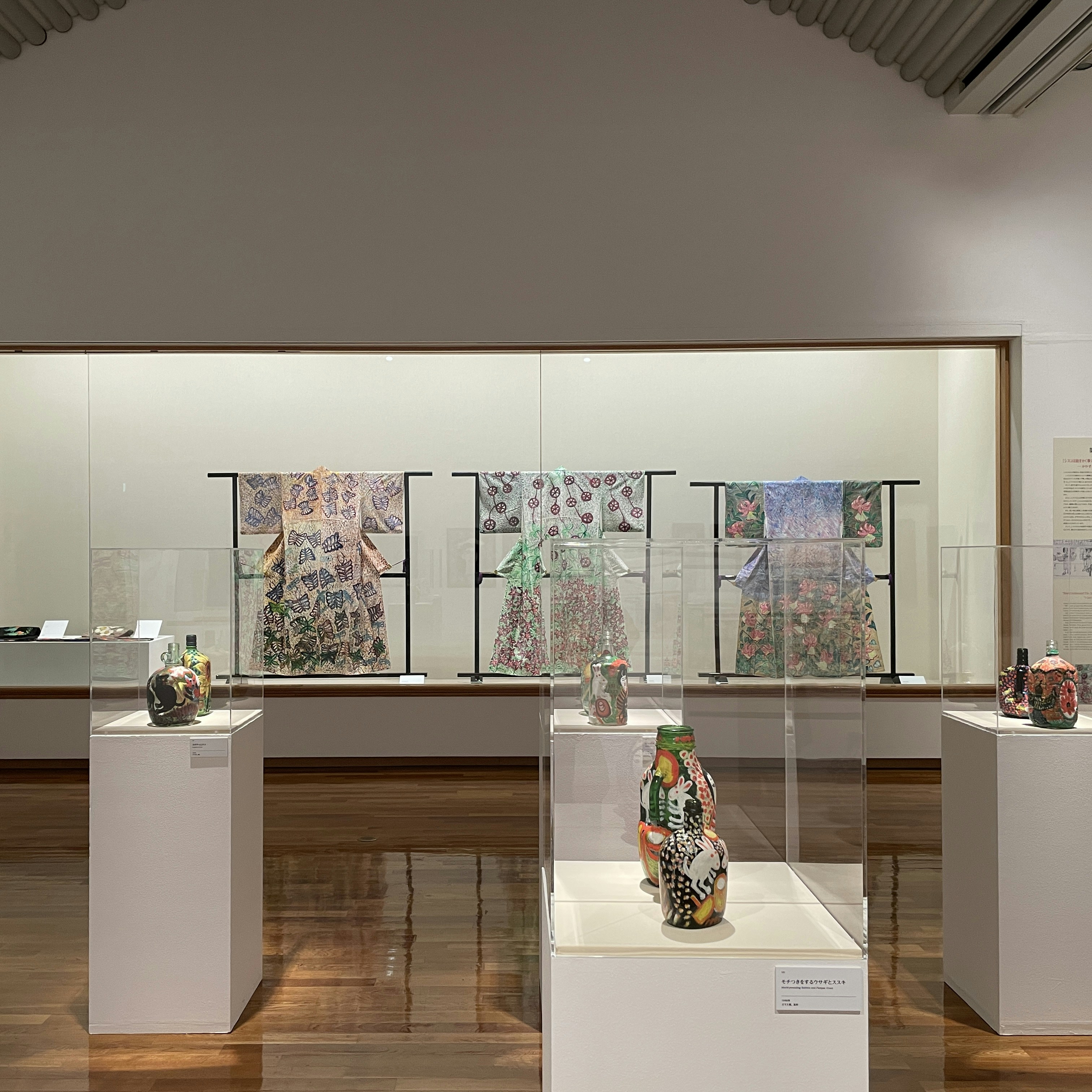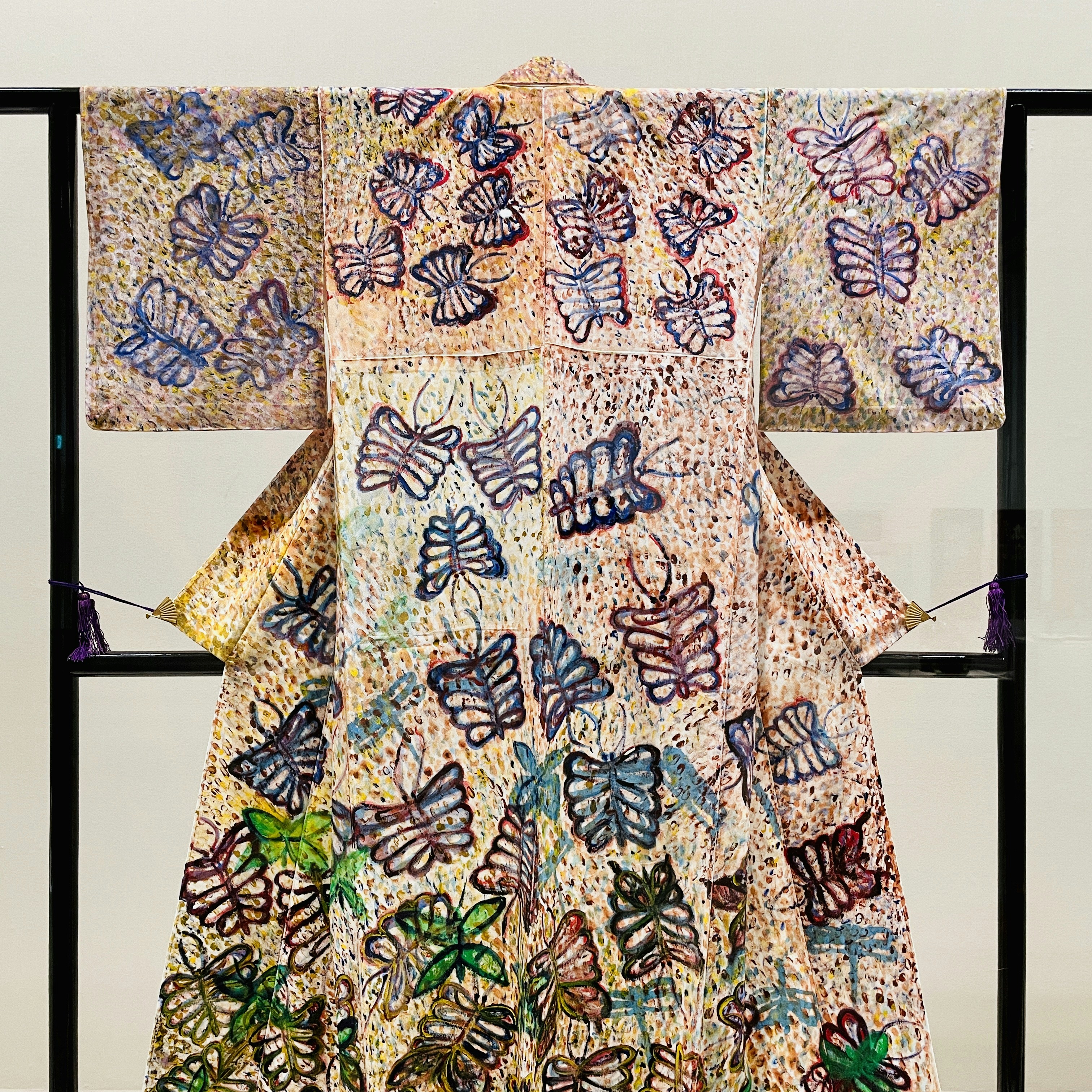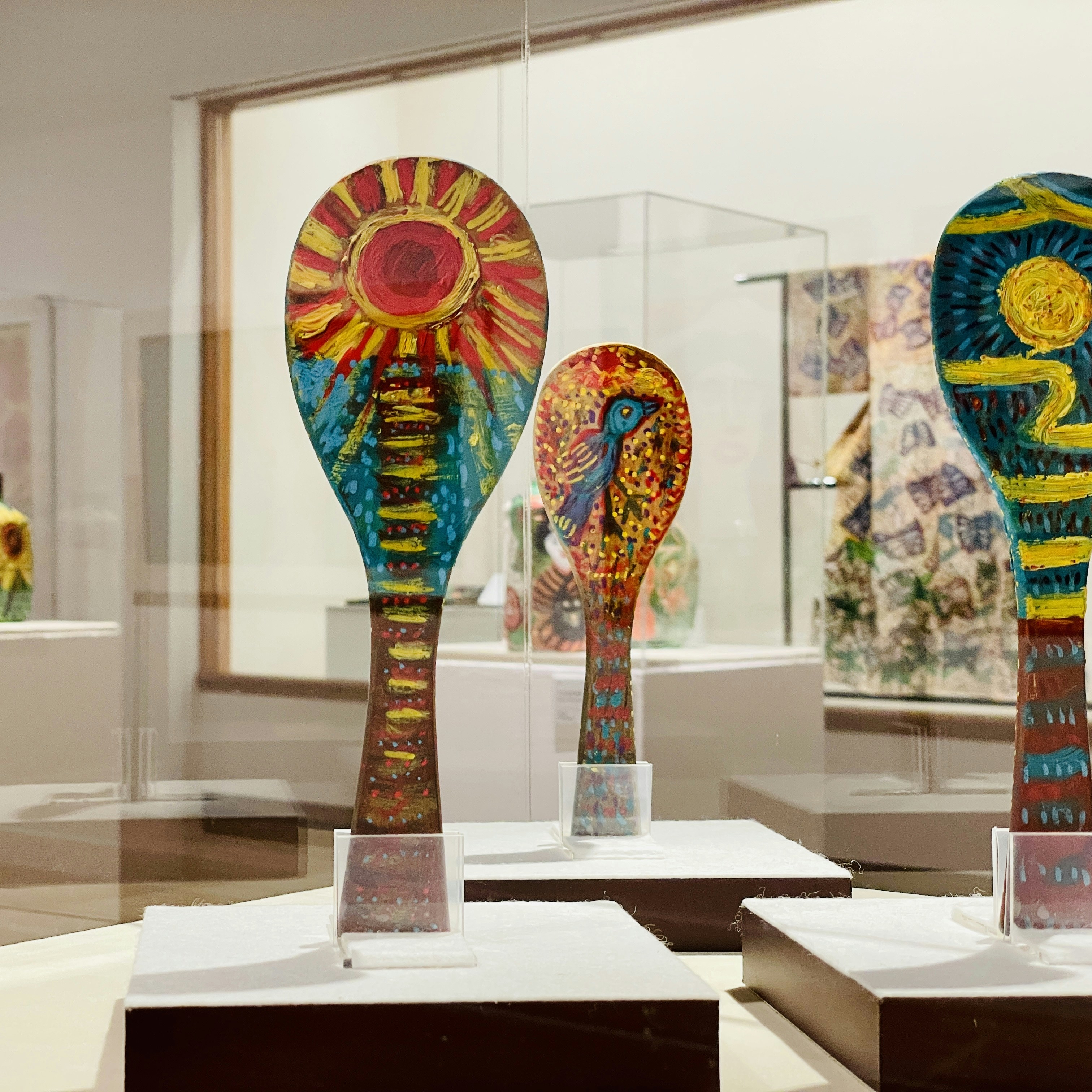 生活と制作の一致は、その独特の画材にも現れている。キャンバスはもちろん使用されているが、そのほかにもダンボールやしゃもじ、空き瓶、竹筒、着物、コタツの板(本展未出品)など、描けるものには絵を描いた。