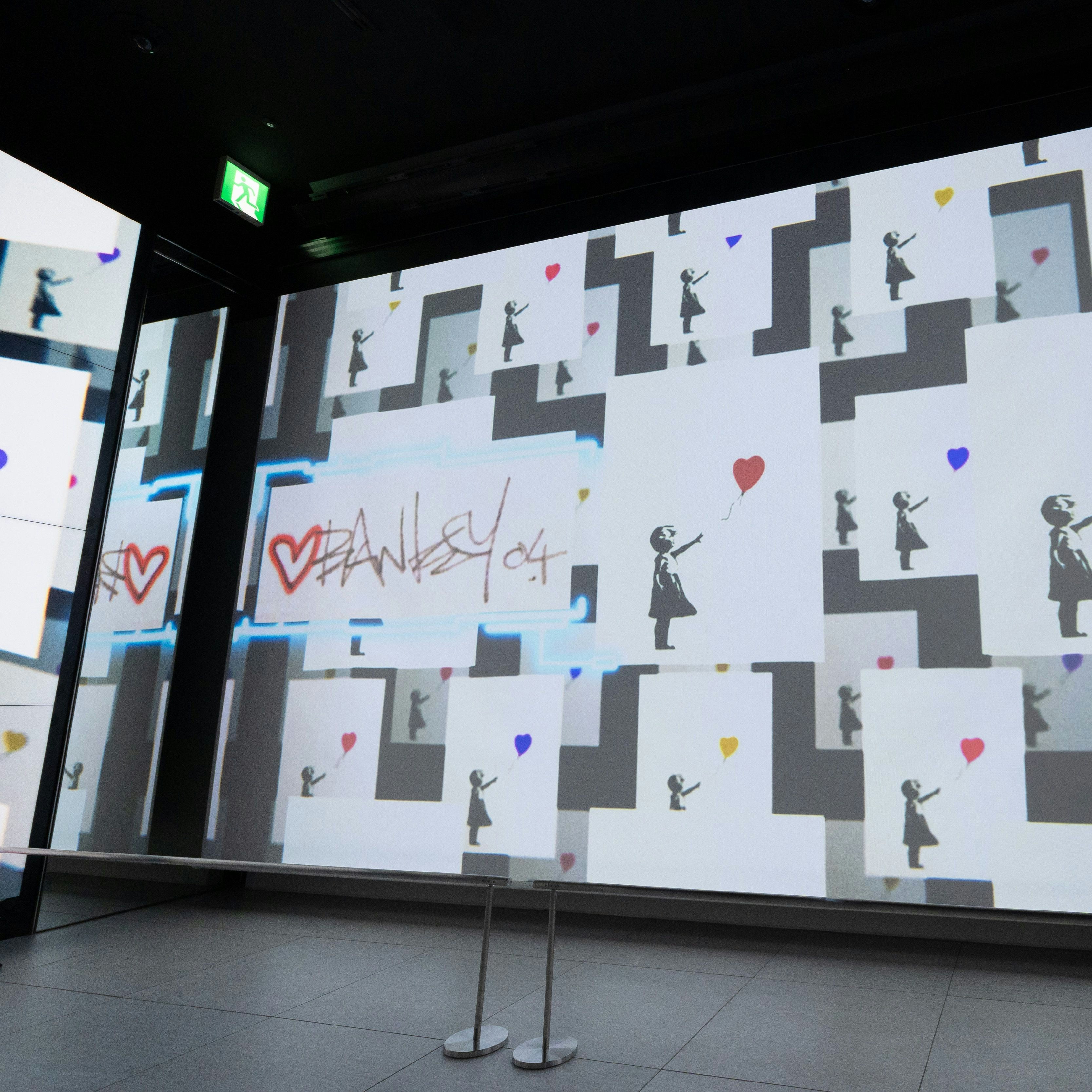 会場に入ると、入口付近にある幕が降り、3面の巨大スクリーンでスペシャルムービーが上映。上映後には正面のスクリーンが上がり、展示室の壁に《風船と少女》が現れる。鑑賞者は近距離で作品を鑑賞し、また作品や両側のスクリーンに映し出される映像と記念写真を撮ることができる。