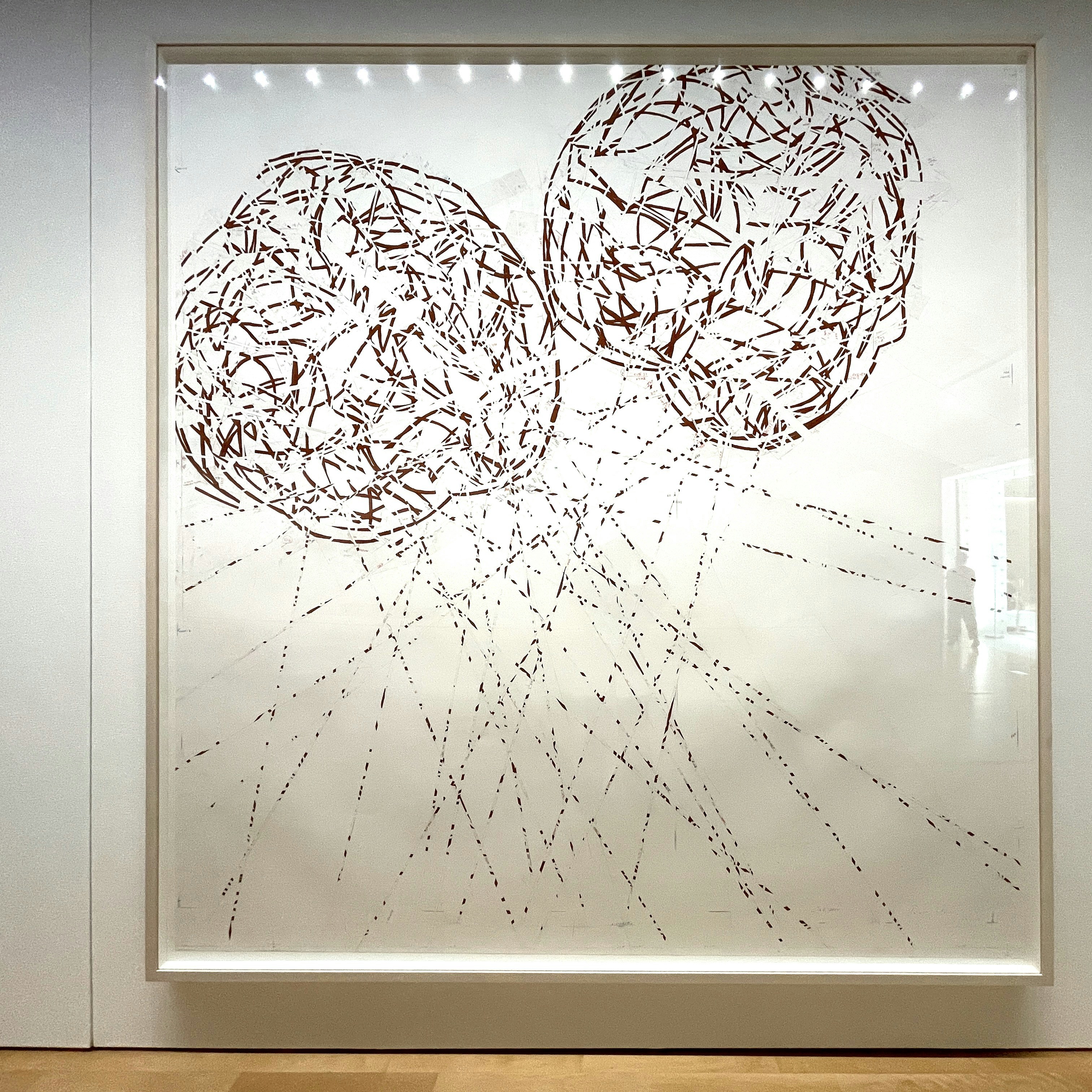 ホーンによってもっとも身近な表現形態だというドローイングは、1982年から今日まで一定して継続される唯一の形式。本展の一室を占める7点のドローイング作品は、高さ約3メートルにおよぶ。そこに記された手書きの記号や印、あるいは紙の切れ目からは、この巨大作品が一度ばらばらに切断され、再び組み合わされたものであることがわかる。