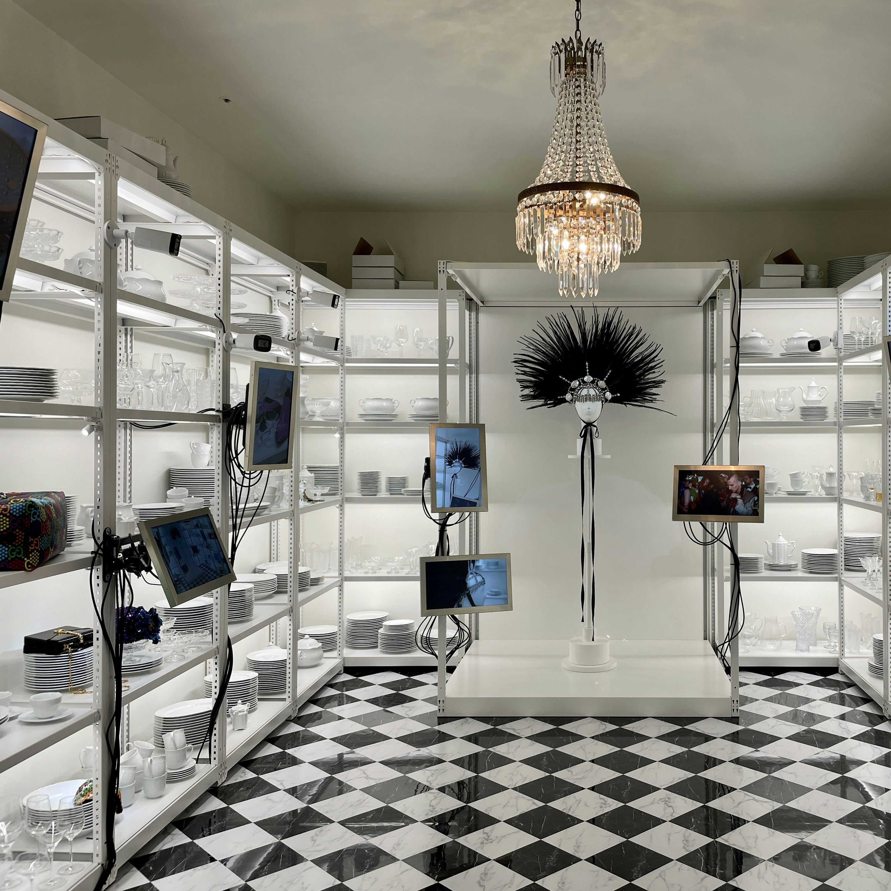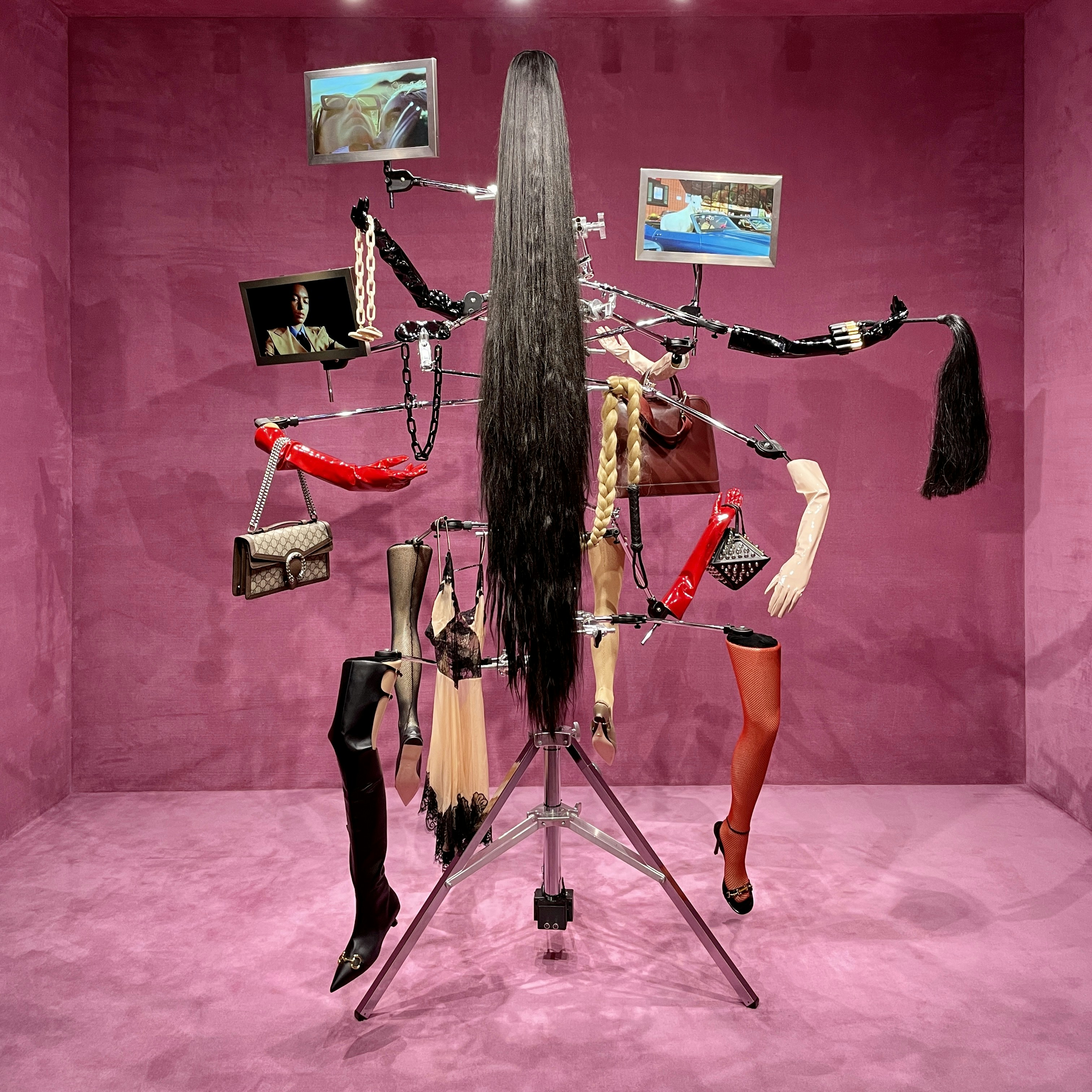 本展は、数十台のモニターが展示される「Control Room」から始まる。それぞれのモニター画面にはグッチの広告キャンペーンの映像が映し出されており、映像と音声が絶えず変化するモニター群は祭壇画のようなもので、アレッサンドロの多元宇宙のようなクリエイティビティへの扉を開く。