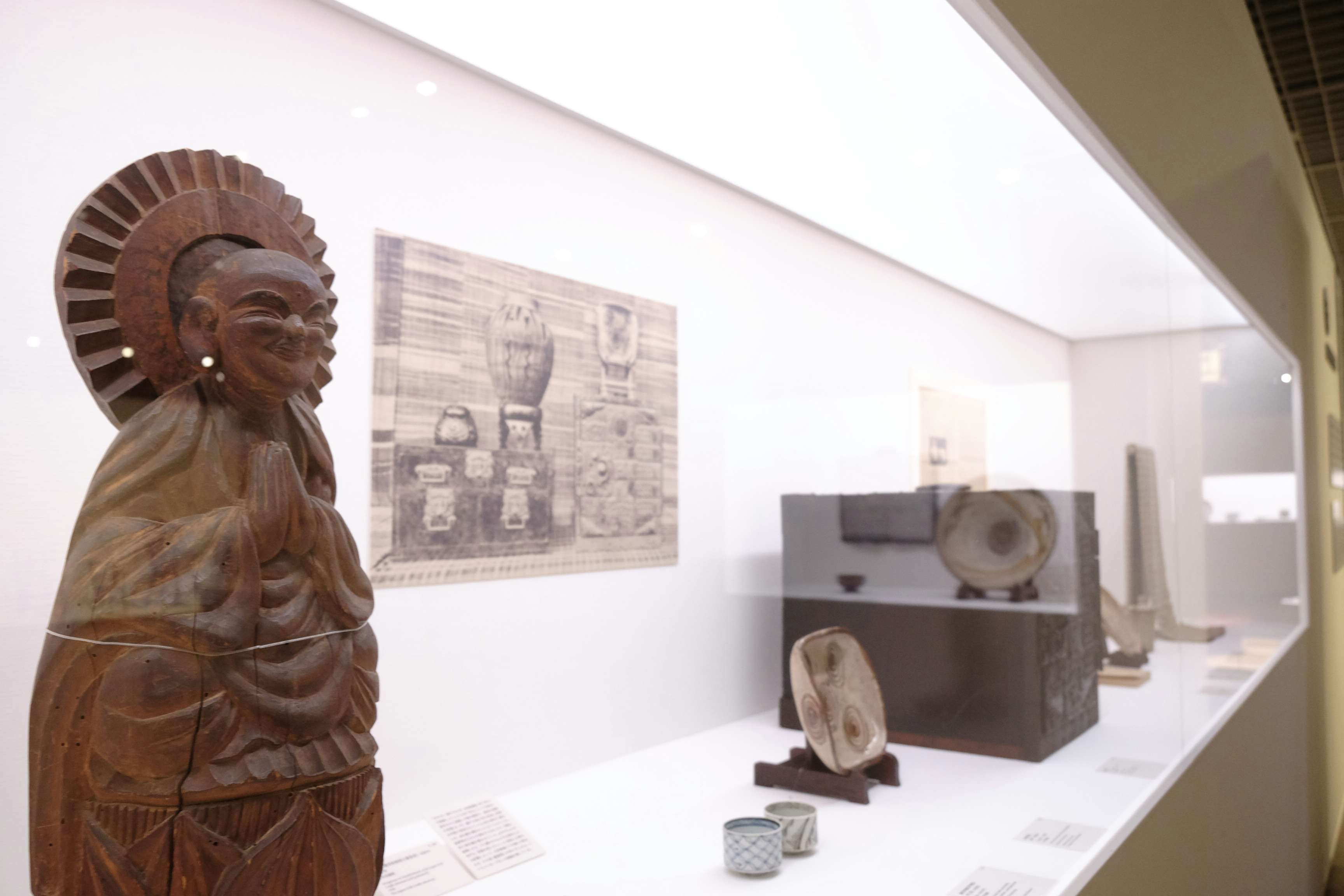 展示風景より、手前は木喰五行《地蔵菩薩像》(1801) 日本民藝館蔵