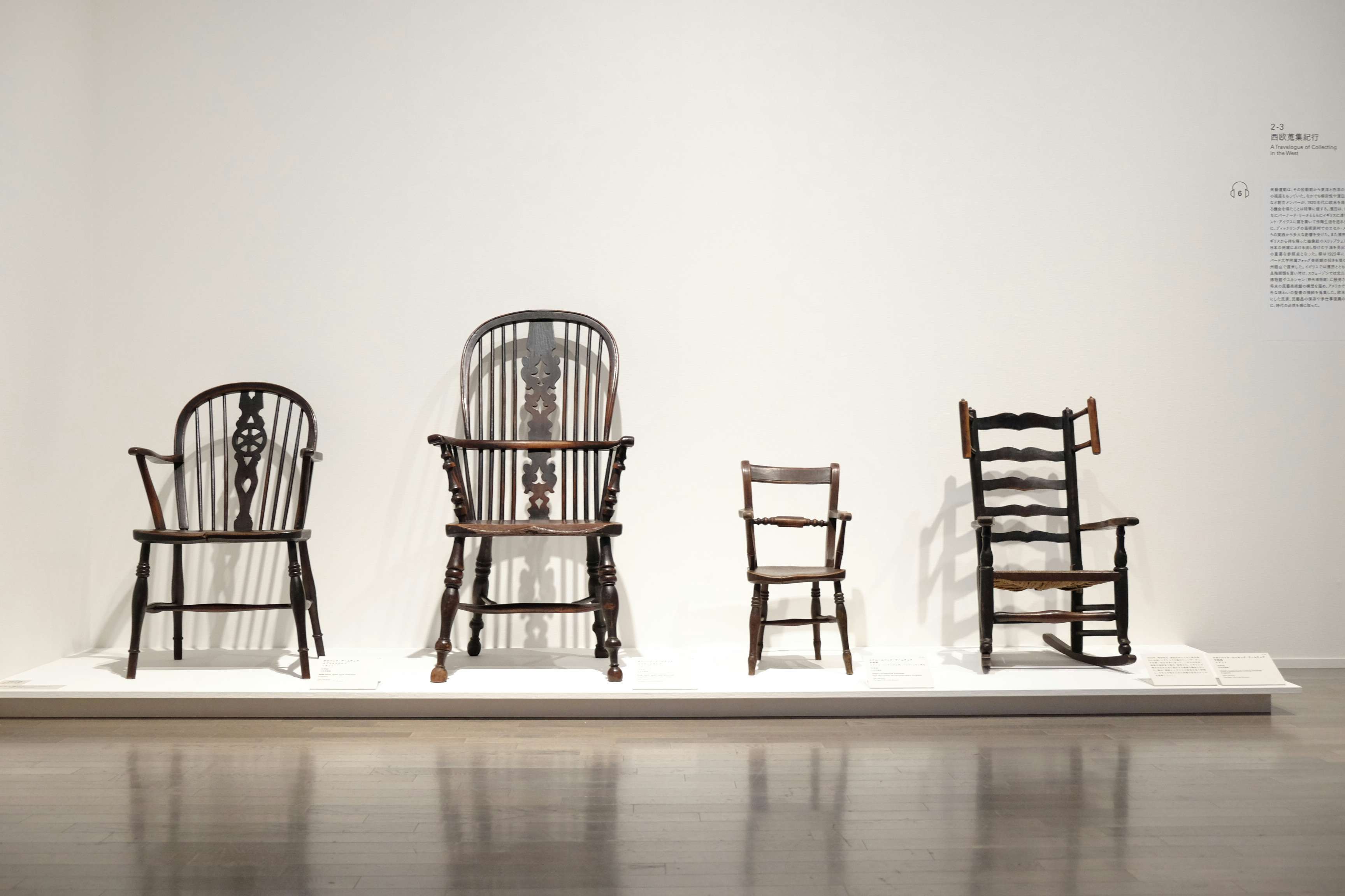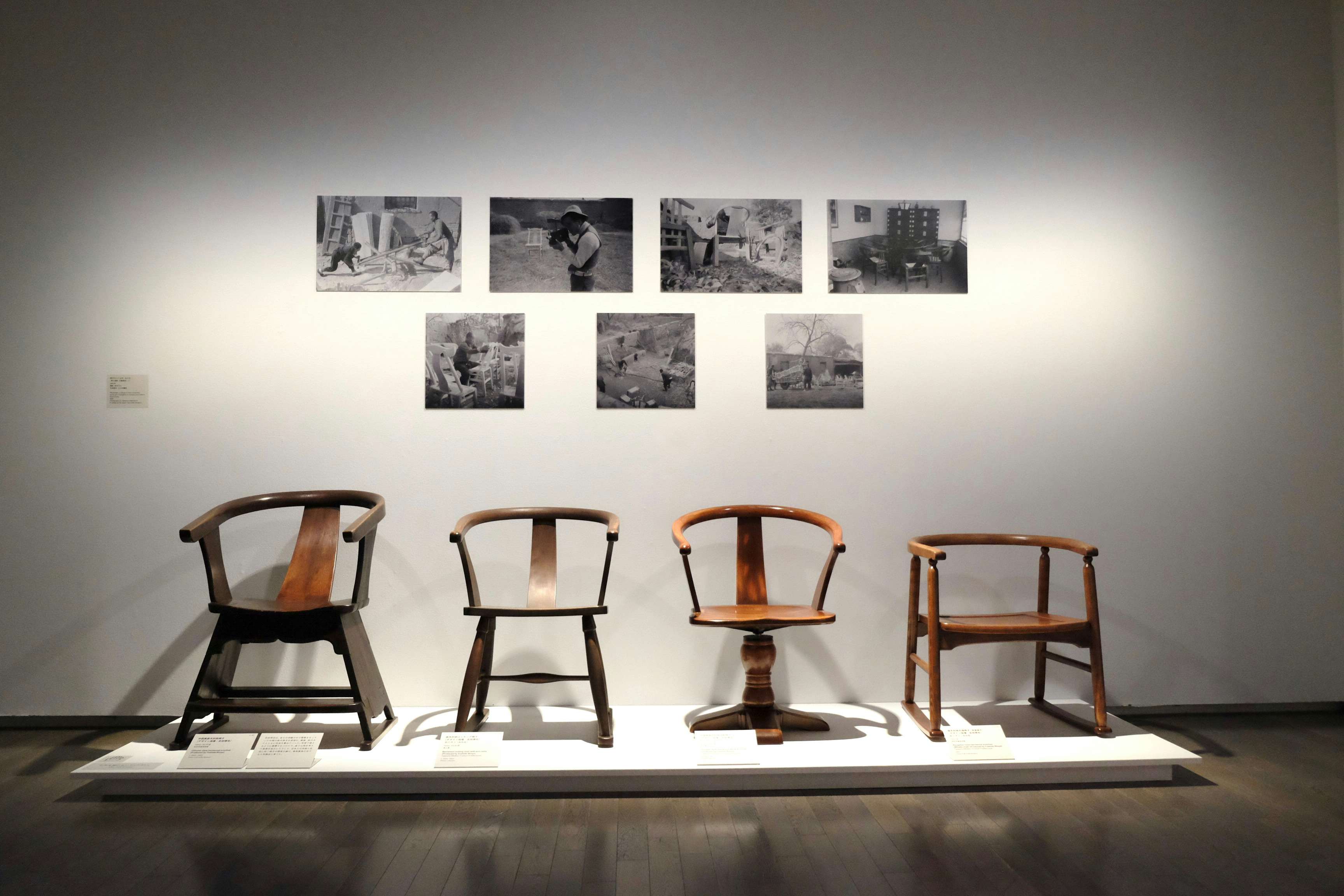 展示風景より、中国曲木椅子を題材につくられた吉田璋也デザイン指導による椅子 (左右:鳥取民藝美術館蔵、中央2点:個人蔵)