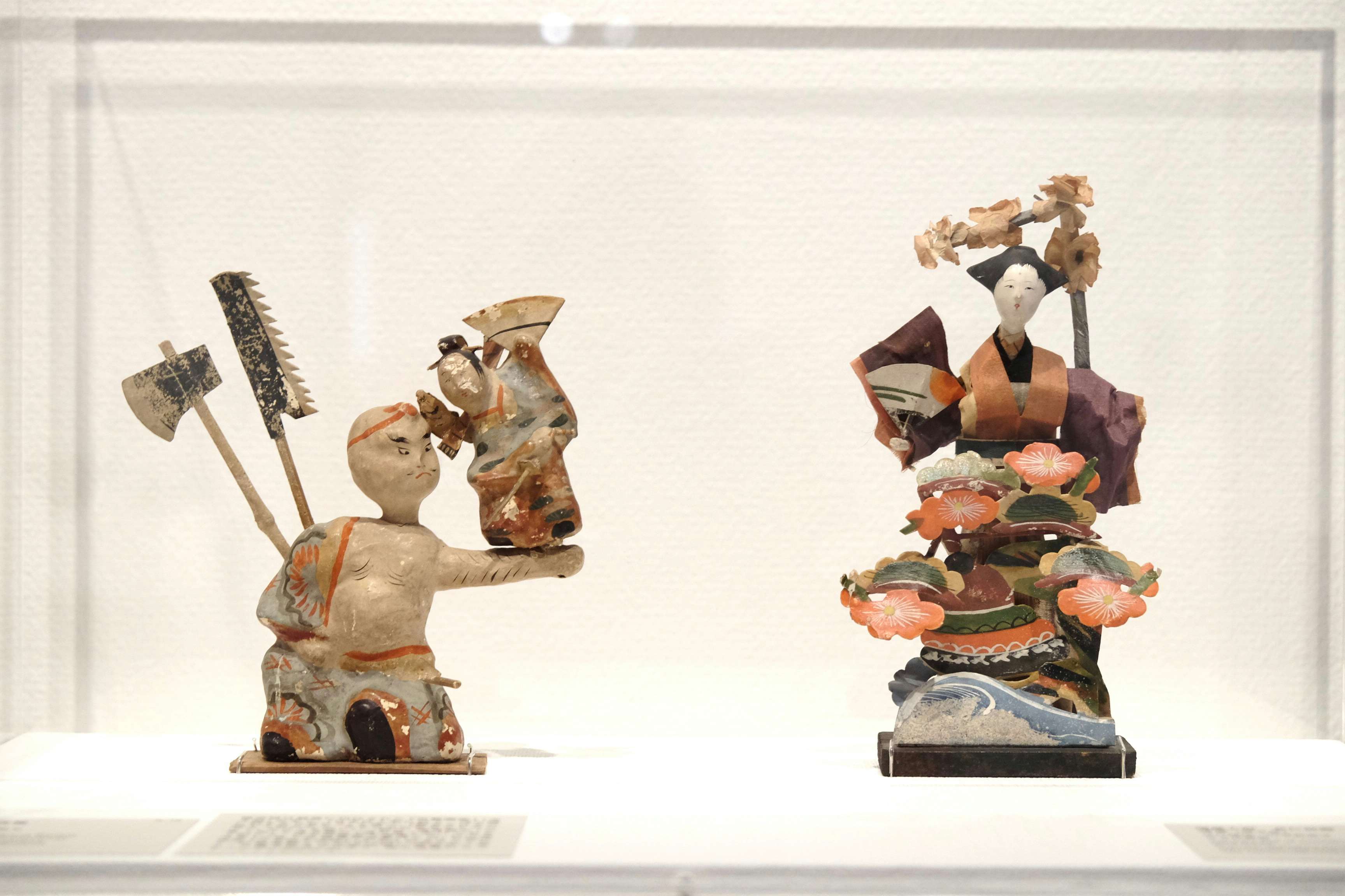展示風景より、左から橘弁慶の三春人形と女に松梅の鴻巣人形(いずれも江戸時代、19世紀後半) いずれも日本民藝館蔵