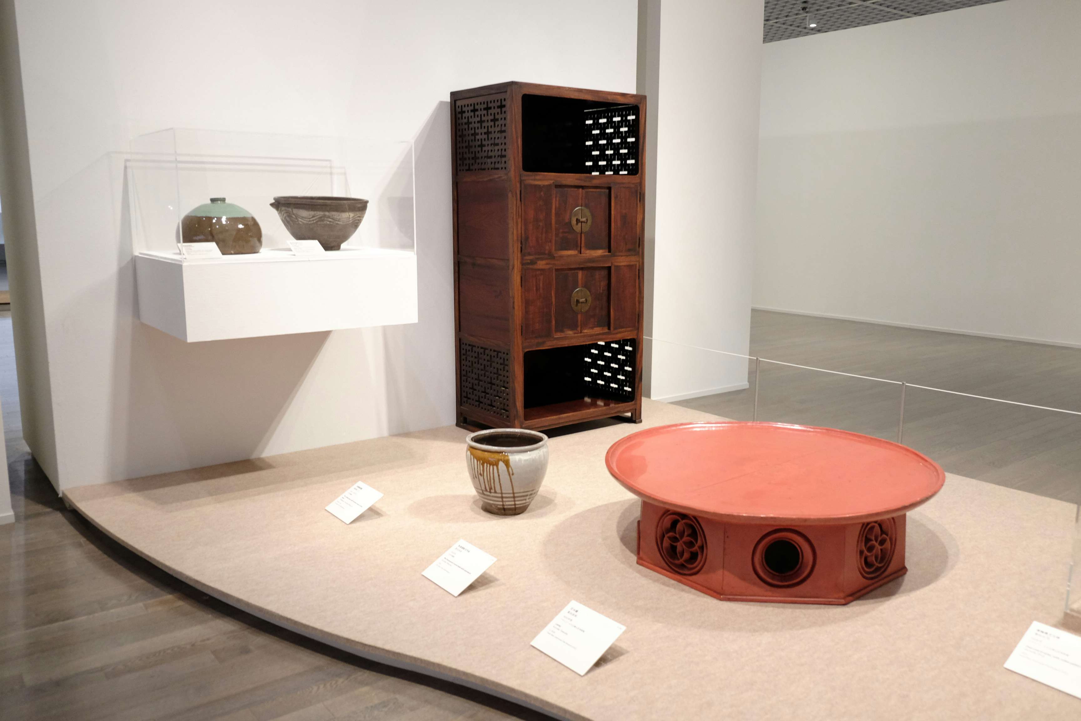 展示風景より、左から朝鮮時代の《四層箪笥》(19世紀)、朝鮮時代の《紙縒卍文八角膳》(19世紀) いずれも日本民藝館蔵