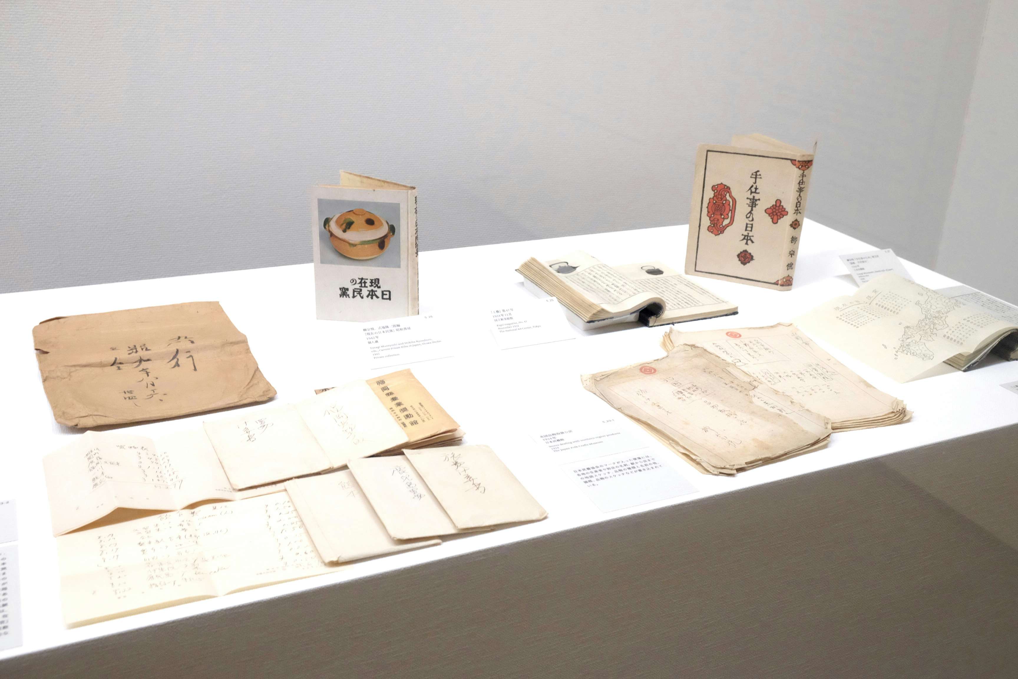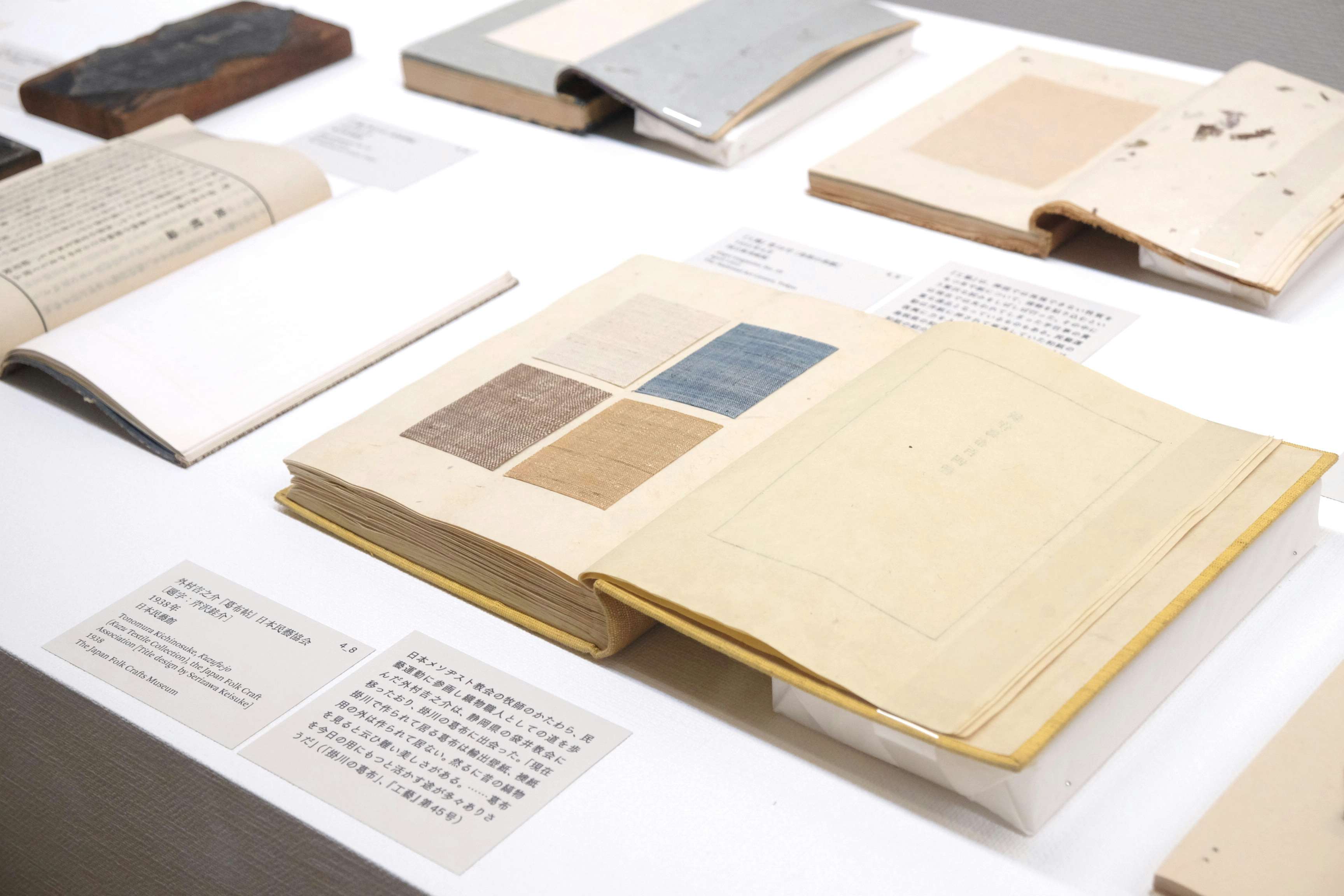展示風景より、柳宗悦『手仕事の日本』(靖文社、1948)[装丁:芹沢銈介]日本民藝館蔵など