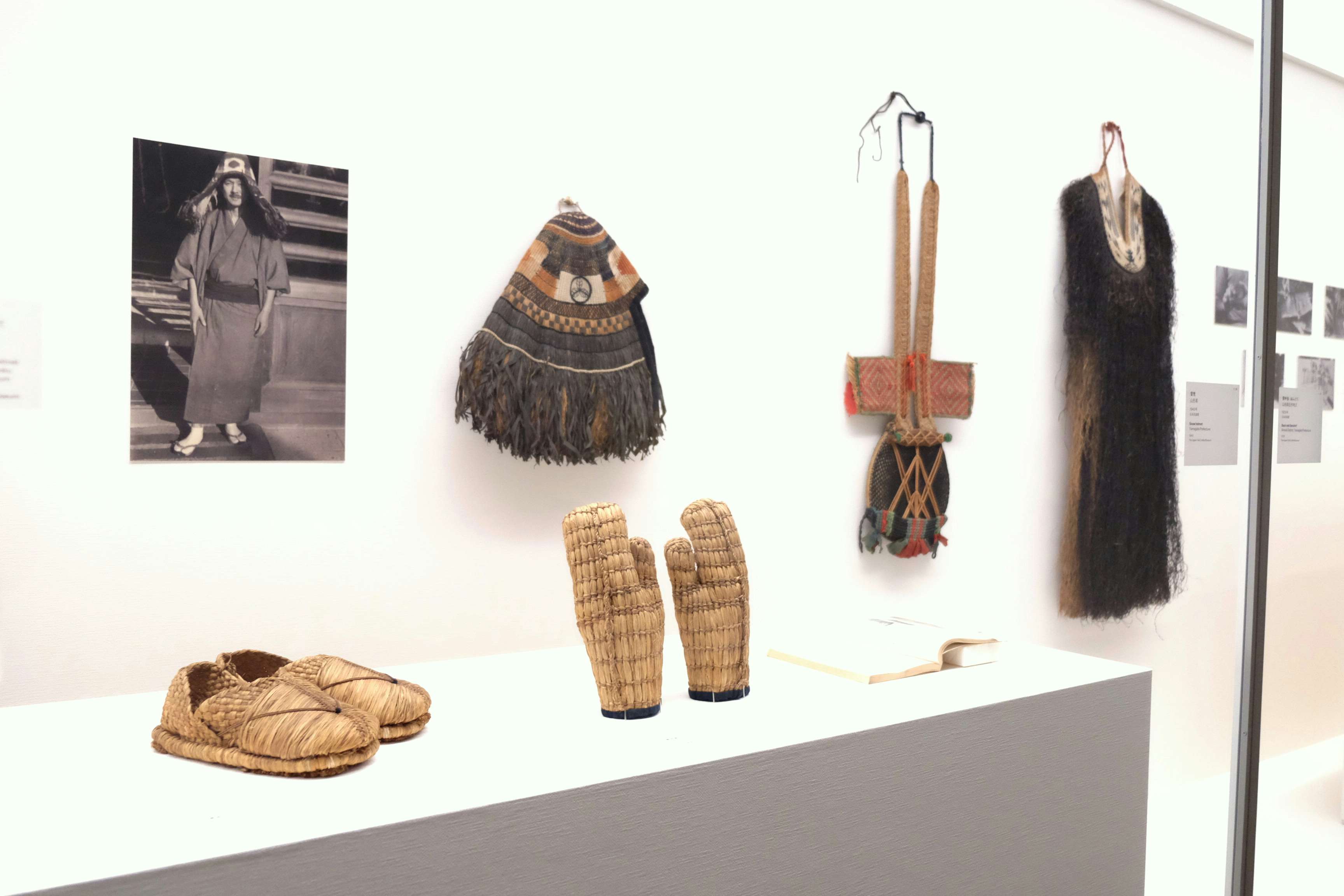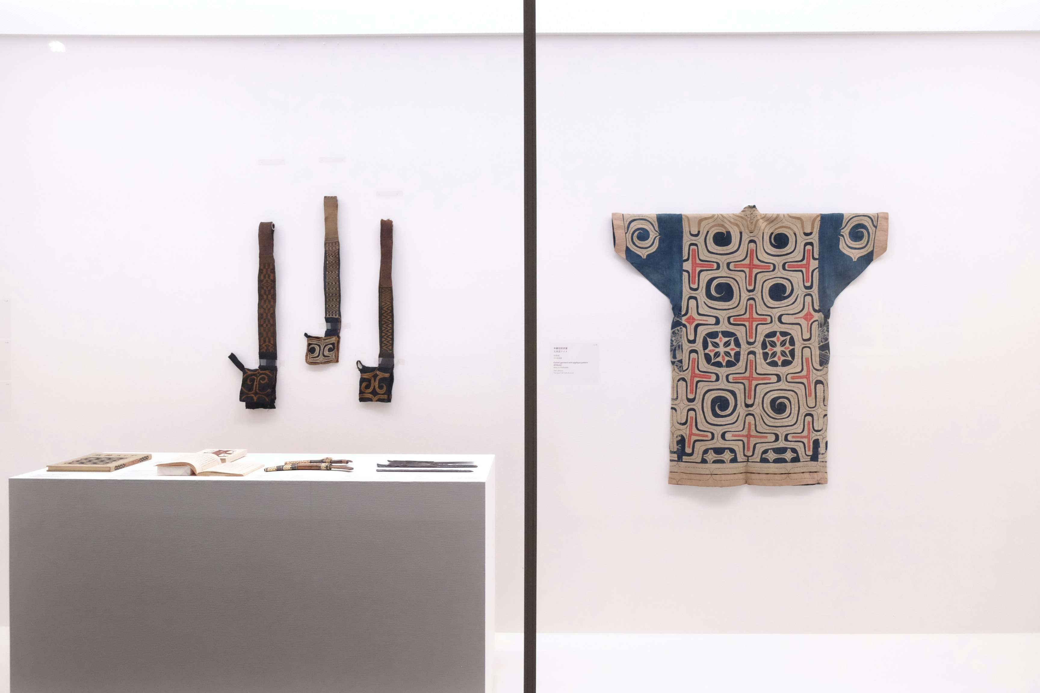 展示風景より、北海道アイヌの《刀掛け帯》(19世紀)や《木綿切伏衣裳》(19世紀、前期展示) いずれも日本民藝館蔵