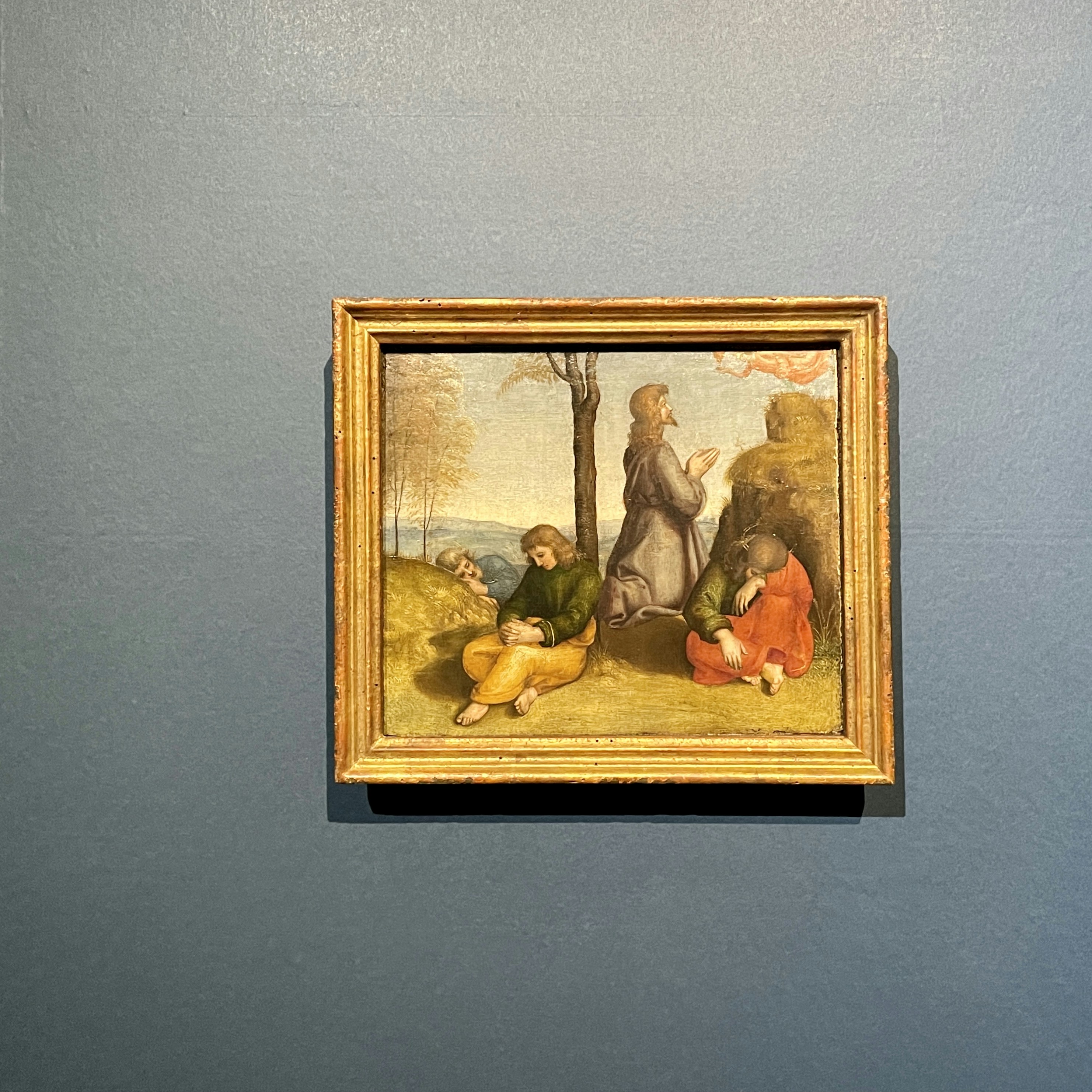 ルネサンスの巨匠ラファエロ・サンティの《ゲッセマネの祈り》(1504頃)は、磔刑への恐れに苦悩しながら神に祈るキリストと、眠り込んでリラックスする弟子たちの姿が描かれたもの。ラファエロが20〜21歳頃に描いた同作では、その初期の繊細優美な作風を堪能できるだろう。