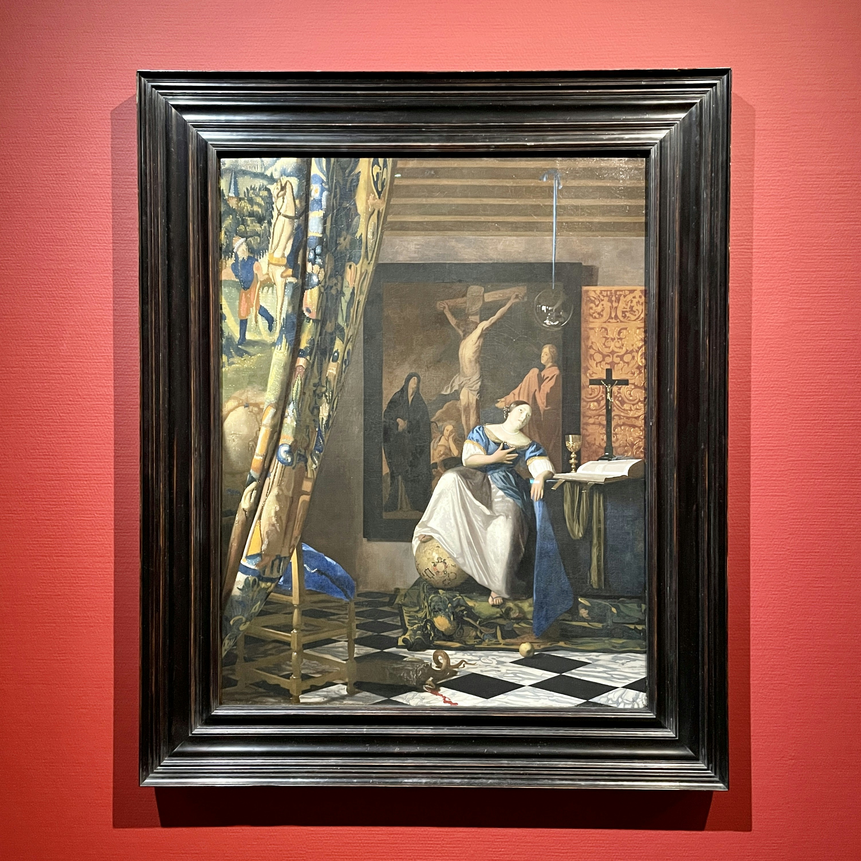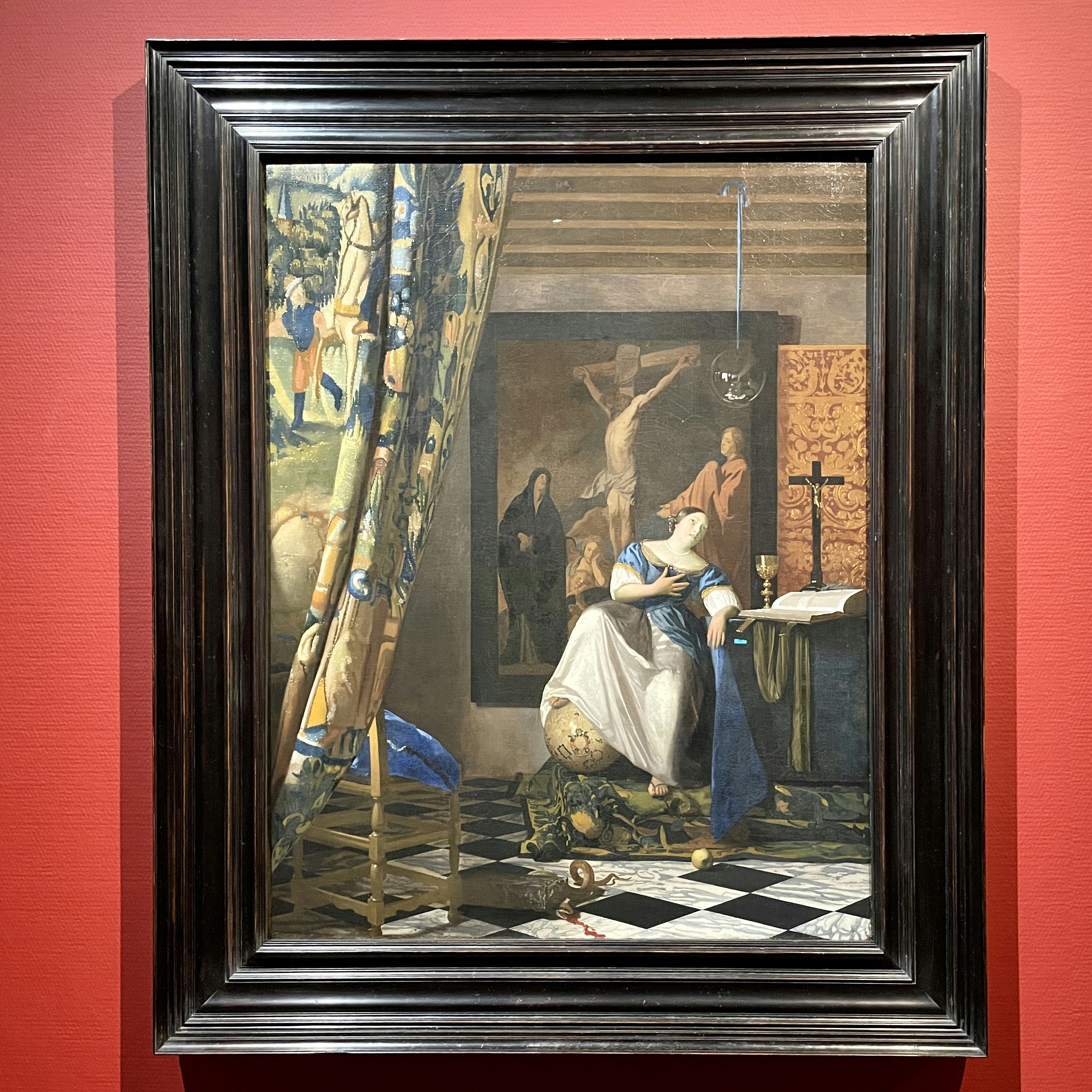 いっぽうの《信仰の寓意》は、風俗画で知られるフェルメールの全作品のなかで唯一の寓意画とされている。キリストの磔刑の絵の前に座る女性は「信仰」の擬人像とされており、地球儀を踏む動作はカトリック協会が世界を支配することを示唆するものと解釈されている。また、十字架、杯、ミサ典書、りんごなどのモチーフにも、宗教的なメッセージが込められている。
