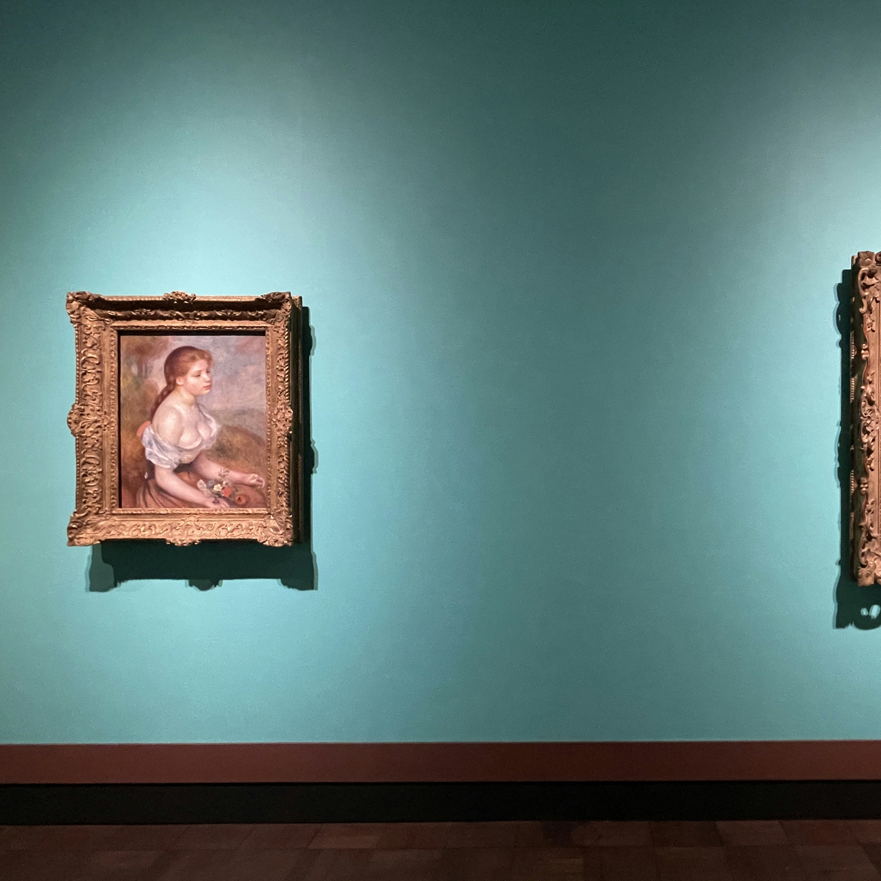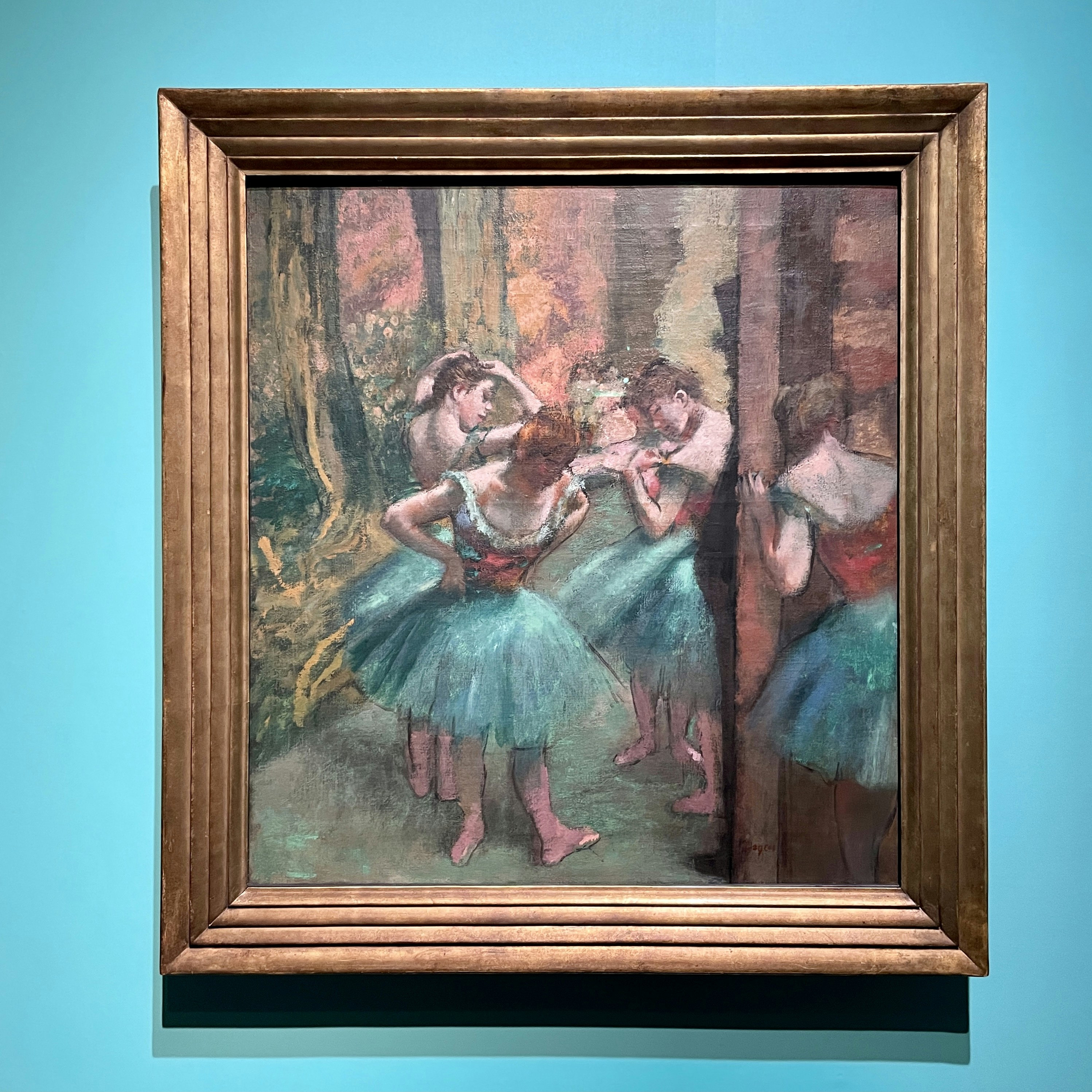 柔らかく軽やかな筆致で少女の姿を描いたオーギュスト・ルノワールの《海辺にて》(1883)や《ヒナギクを持つ少女》(1889)、舞台裏で衣装を整える踊り子たちの姿を切りとって描いたエドガー・ドガの《踊り子たち、ピンクと緑》(1890)も、都市のなかで生活を送っている人々の姿を生き生きととらえている。